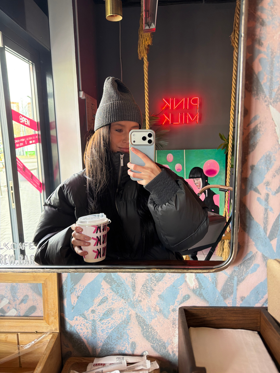 A young woman is captured in a mirror selfie, seen from the chest up, inside what appears to be a cafe in Khimki, Russia. She has long, dark hair and is wearing a grey knit beanie and a black puffer j…read more
