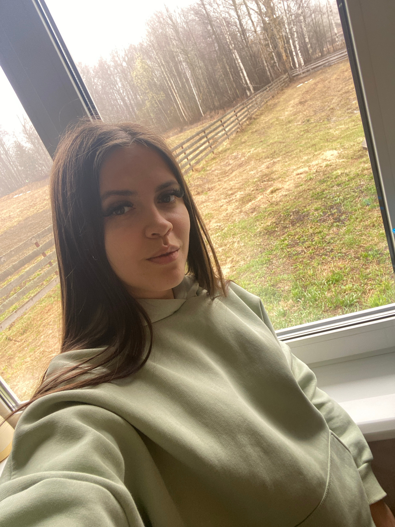 A young woman is depicted in a sideways image, looking towards the camera from an upward angle, likely taking a selfie from indoors. She has long, dark hair and is wearing a plain, light green hooded…read more