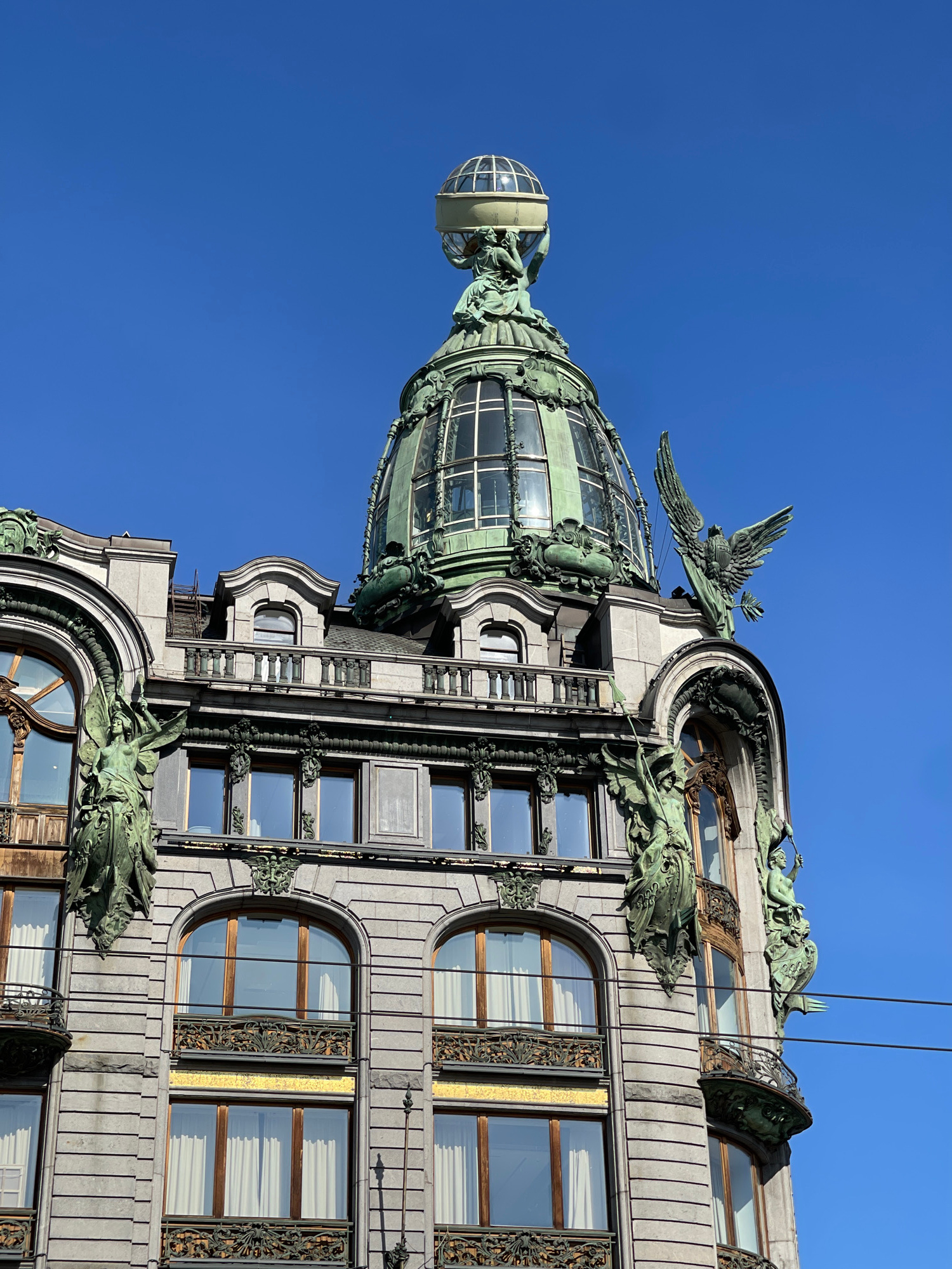 The image shows a portion of the Singer House, an Art Nouveau building in Saint Petersburg, Russia. The structure is predominantly gray with bronze-colored ornamentation. The most prominent feature is…read more