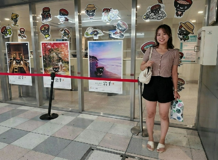 An East Asian female, estimated to be in her 20s, stands smiling and facing the camera in what appears to be a public concourse or information center, likely within a major transportation hub such as…read more