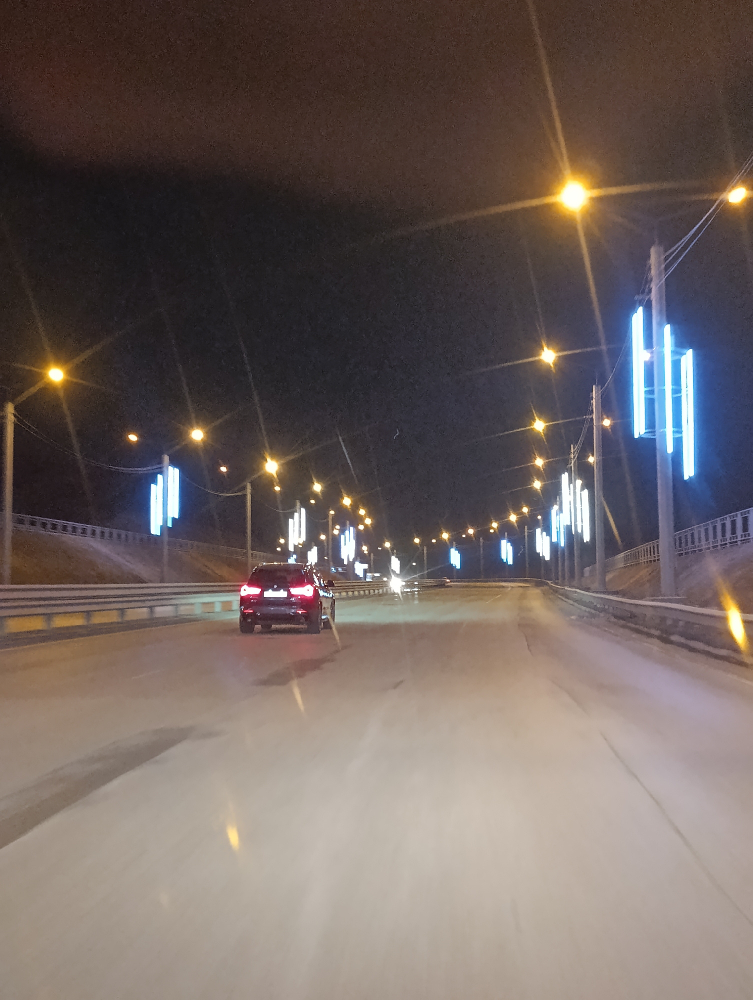 The image depicts a nighttime scene on a multi-lane road in Krasnoyarsk, Russia. A dark-colored car with illuminated rear lights is traveling away from the viewer. Rows of streetlights line the road,…read more