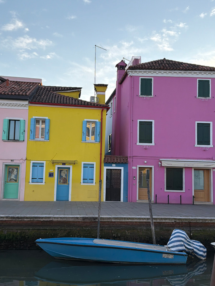 The image depicts a row of vibrantly colored multi-story residential buildings lining a canal in Burano, Venice, Italy, under a partly cloudy blue sky. From left to right, the visible structures incl…read more