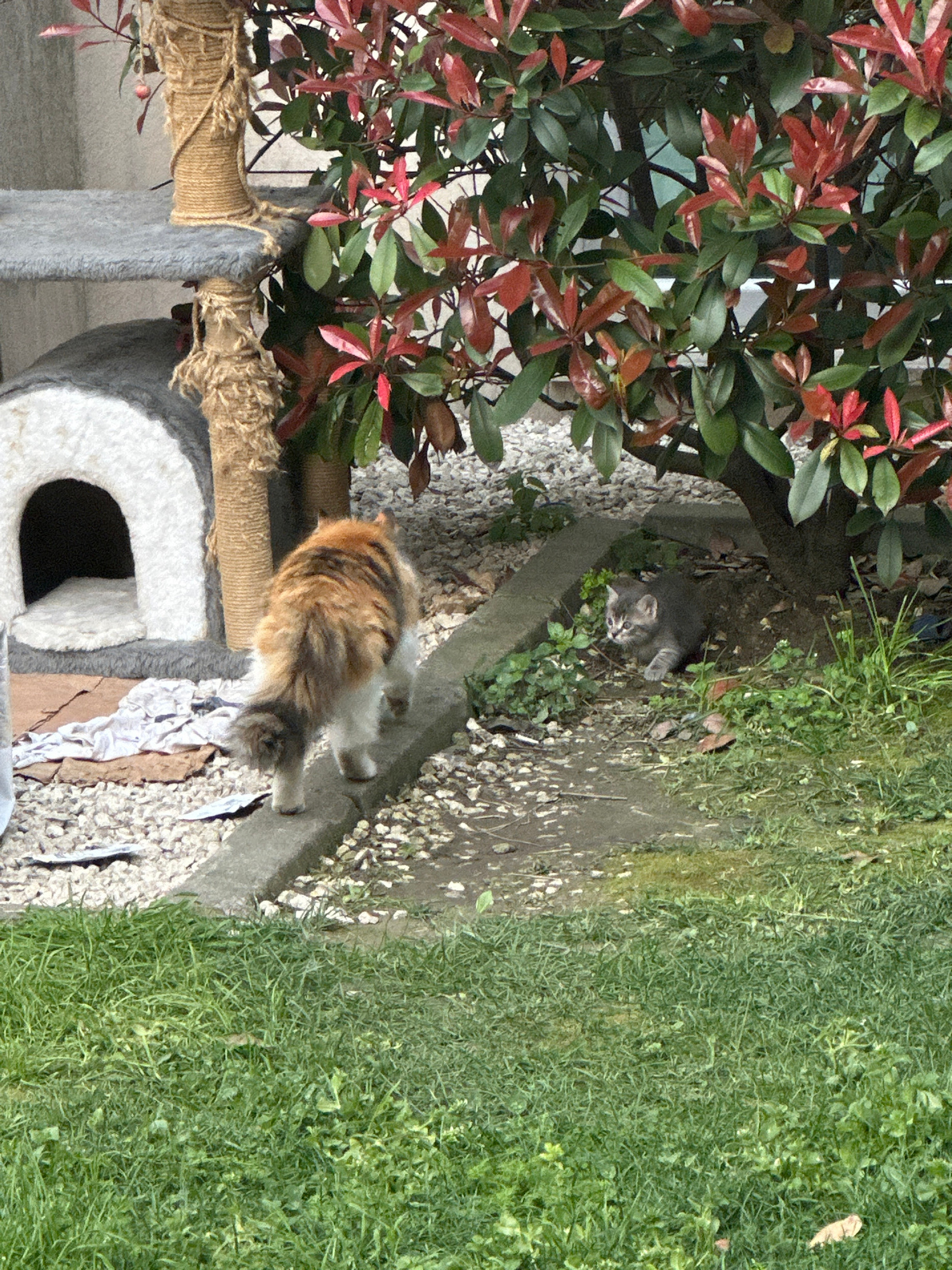 The image shows a partially obscured outdoor scene in Esenyurt, Turkey. A cat tree with a hollow base, covered in fabric, is situated next to a plant with green and red leaves. On the ground, there arβ¦read more