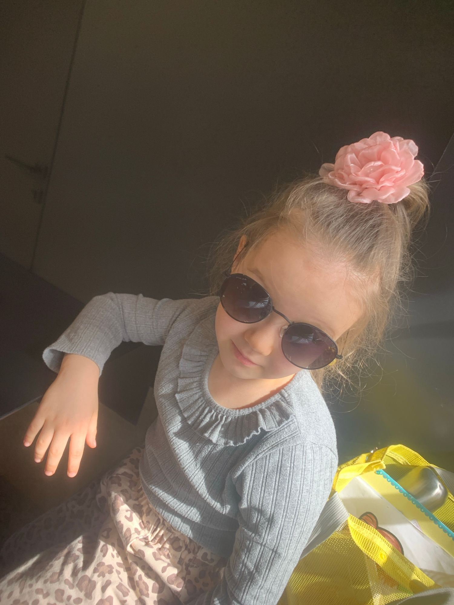 A girl is positioned above the camera, looking down with sunglasses on. She has a pink flower accessory in her hair. The girl wears a gray long-sleeved shirt and patterned pants. Part of a yellow meshβ¦read more