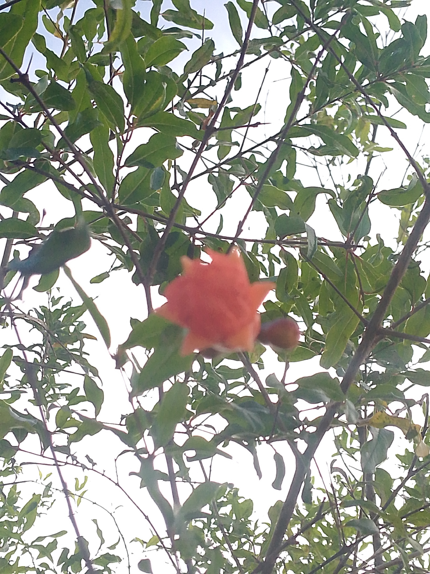 The image displays a low-angle, upward-looking perspective of a pomegranate plant (Punica granatum) situated in Juan Griego, Venezuela. The scene is dominated by green foliage and branches silhouetted…read more