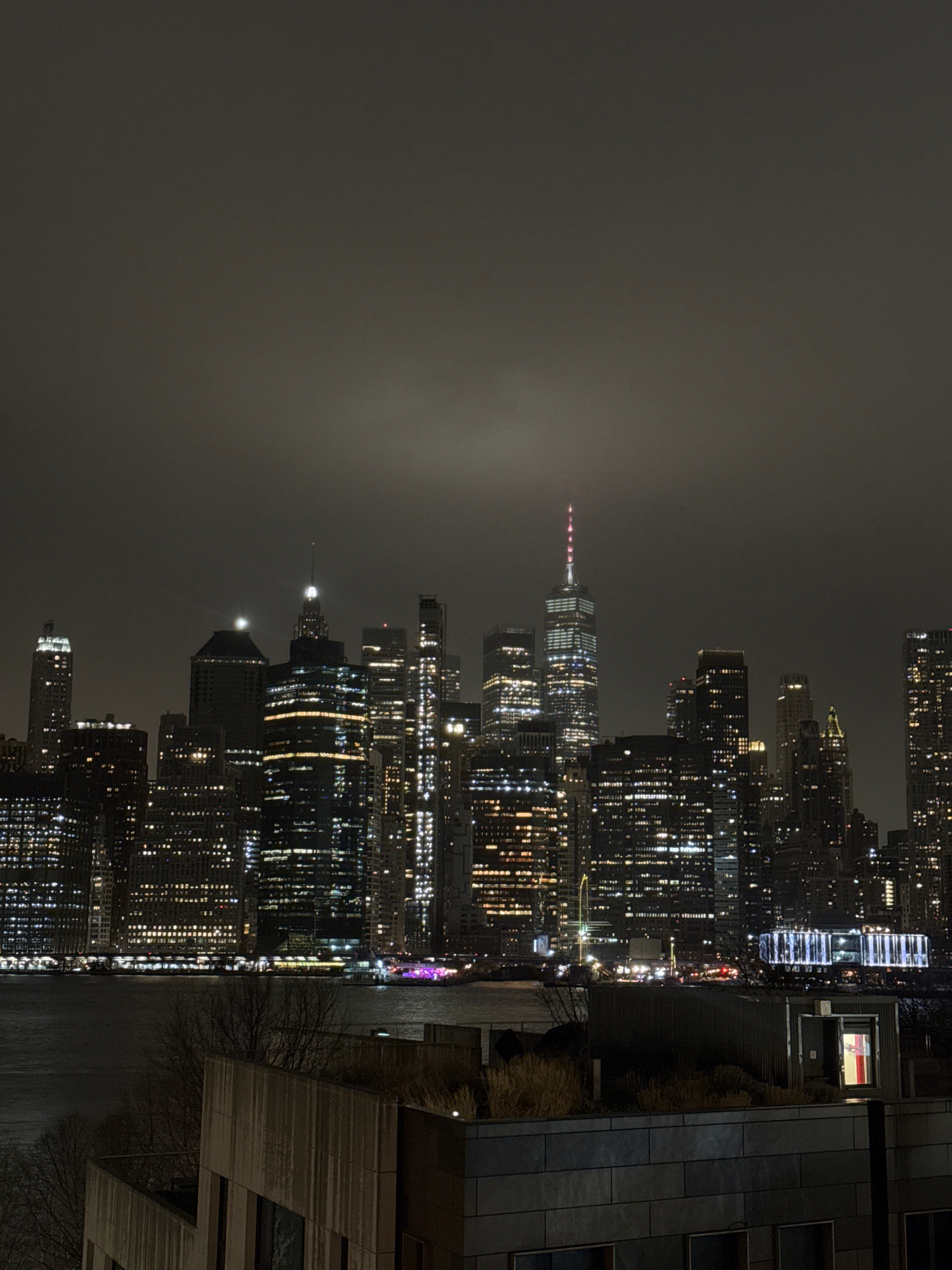 This image depicts a nighttime view of the New York City skyline on a hazy or foggy night. The buildings are brightly illuminated, with many visible lights from individual windows. The tallest buildin…read more