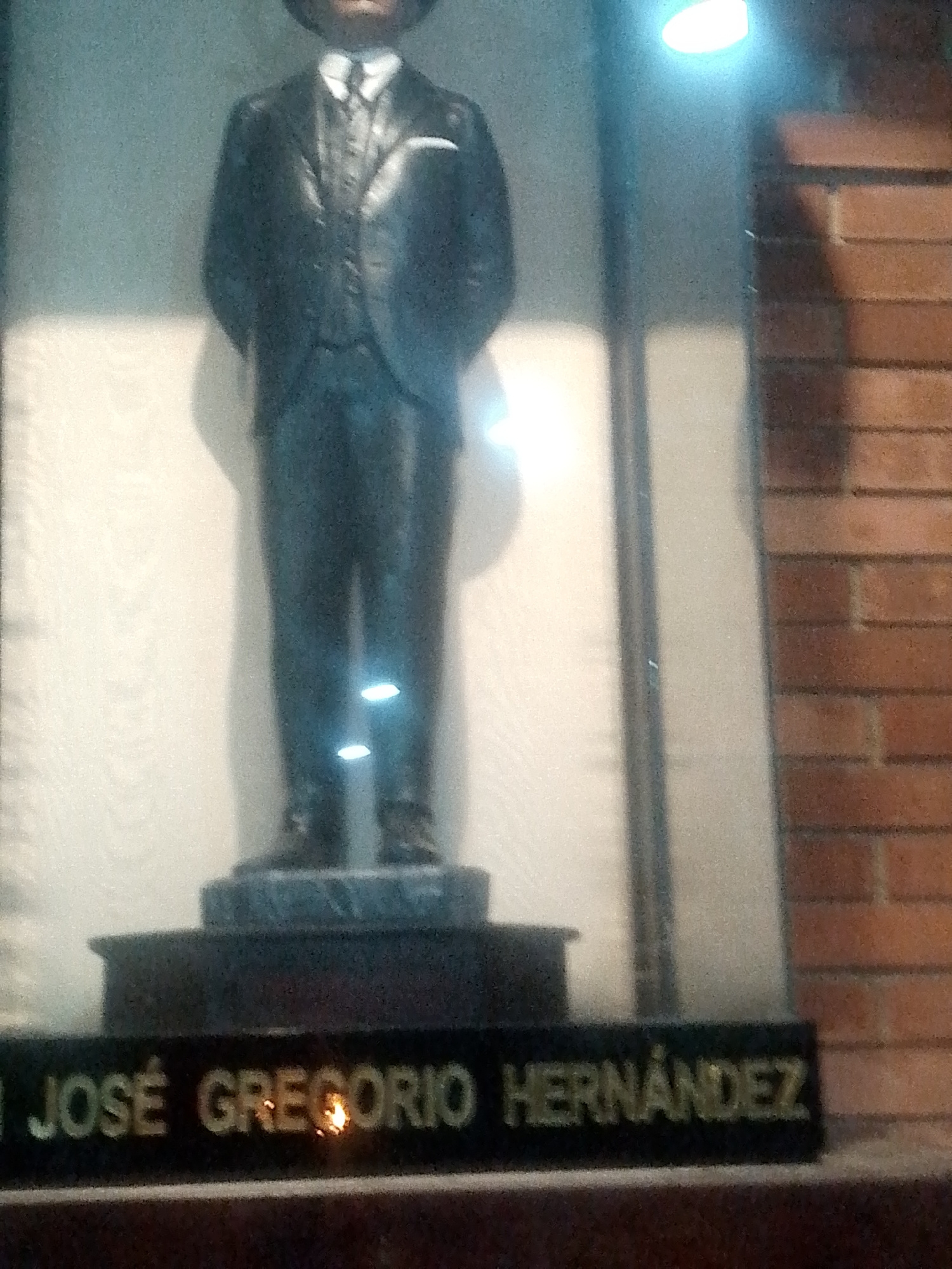 The image shows a statue of José Gregorio Hernández on display behind glass. The statue is dark in color, depicting a man in a suit, and is placed on a pedestal. A plaque bearing his name in gold lett…read more
