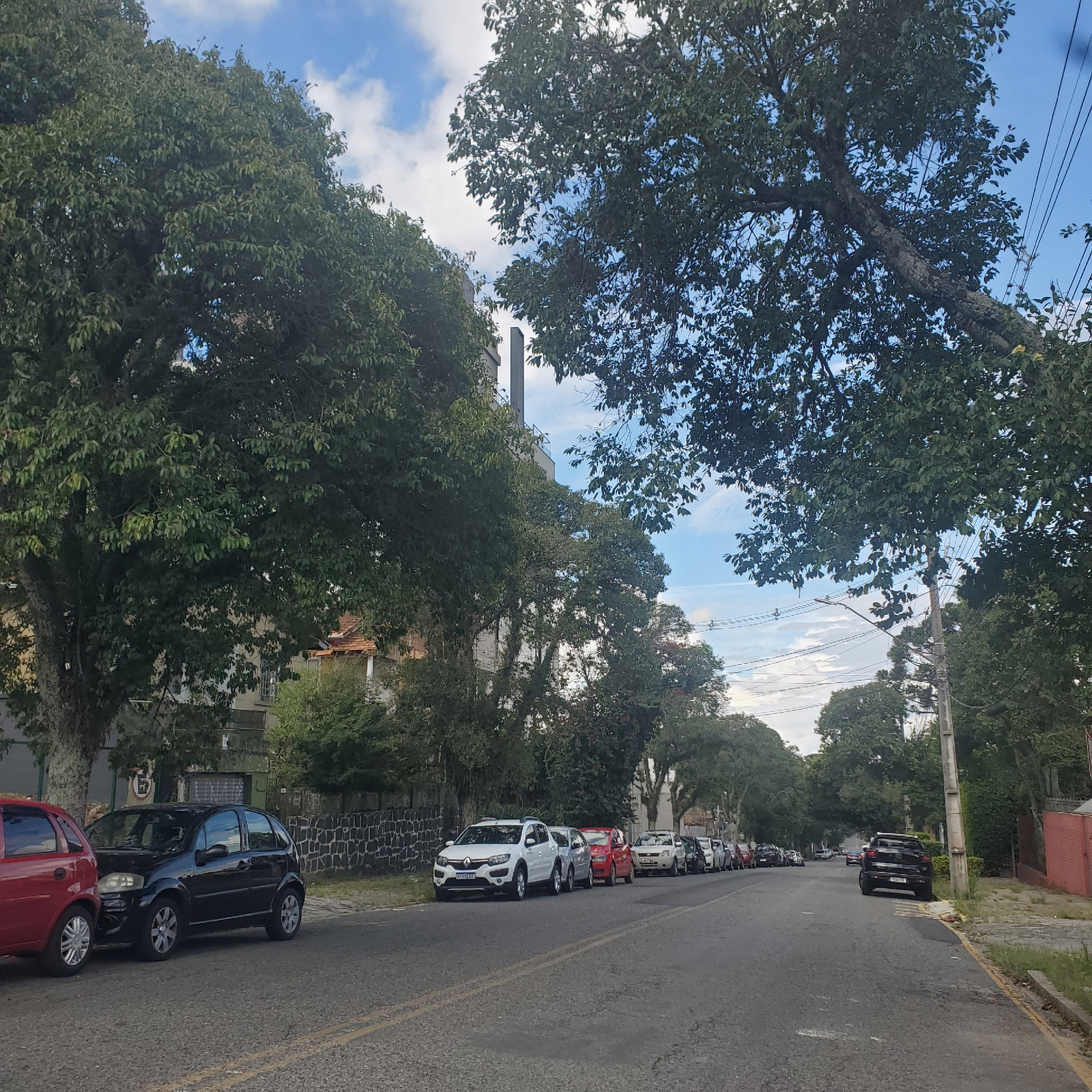 A photograph depicts a tree-lined street in Curitiba, Brazil, flanked by parked cars. The vehicles, a mix of colors and models, are parked tightly along the roadside. Overhead, dense tree foliage crea…read more