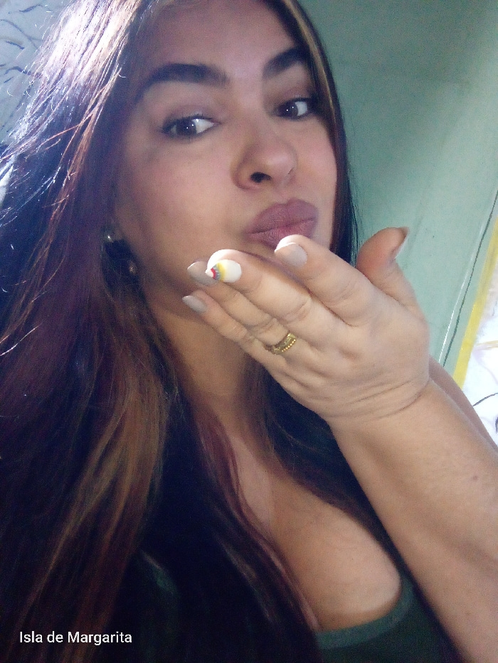 A woman with long, dark hair and a blonde streak poses for a selfie, blowing a kiss towards the camera. She has light skin, arched eyebrows, and full lips. She wears a gold ring on her finger and has…read more