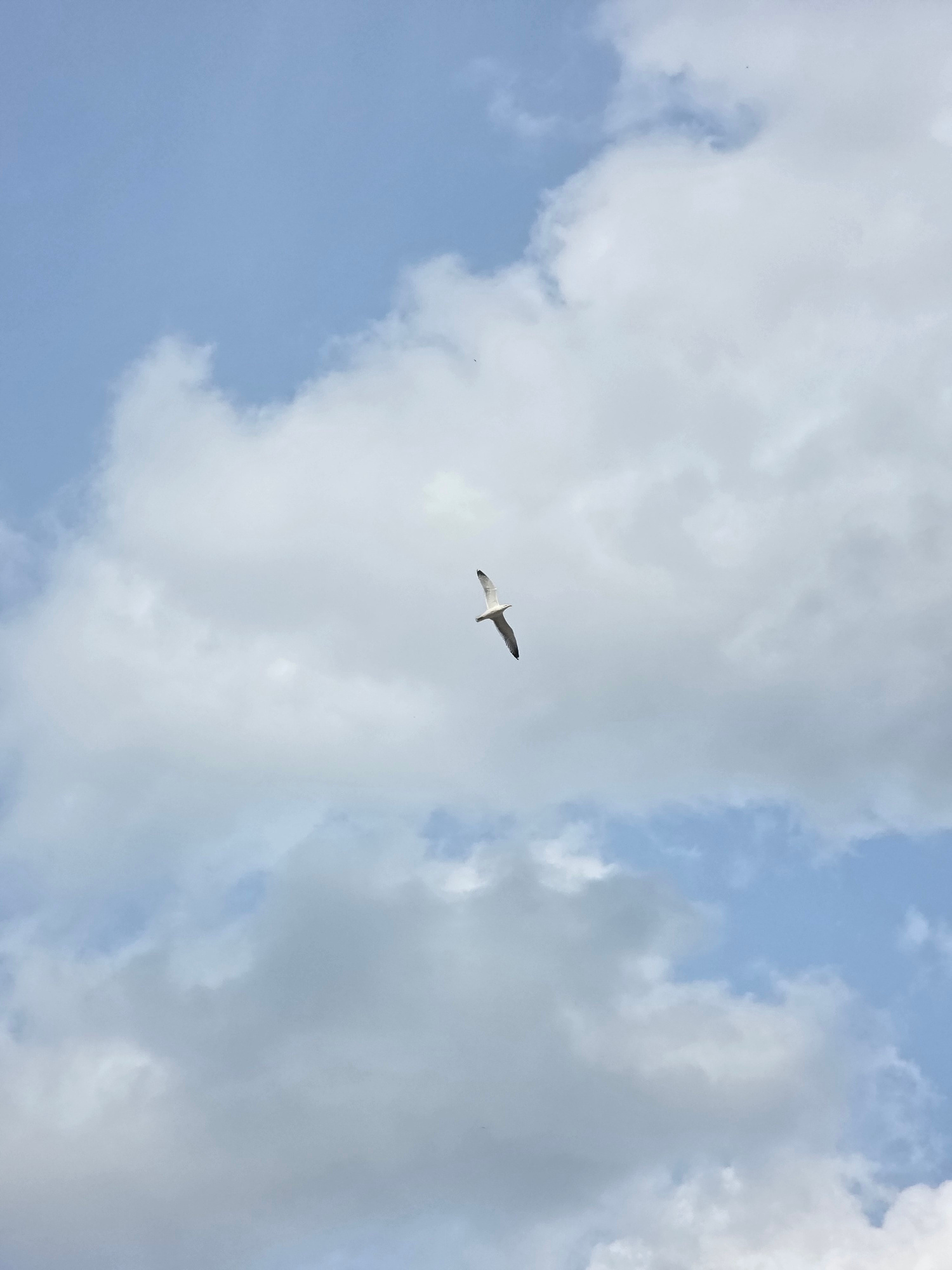 A lone gull flies against a backdrop of cumulus clouds and blue sky. The location is Chaikovsky, Russia.