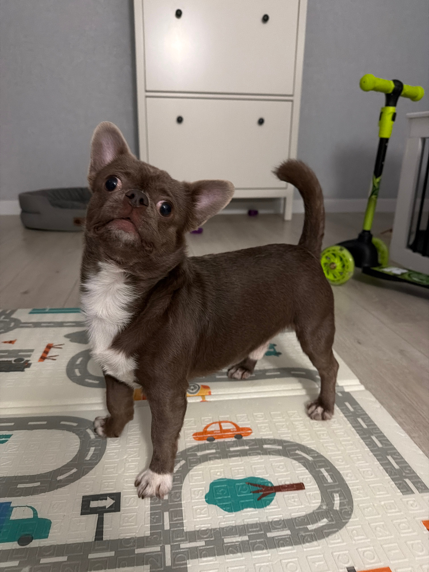 A small, brown and white dog lies on its back or side on a patterned playmat in an indoor setting. The dog has short, chocolate brown fur with a prominent white chest and white markings on its paws. I…read more