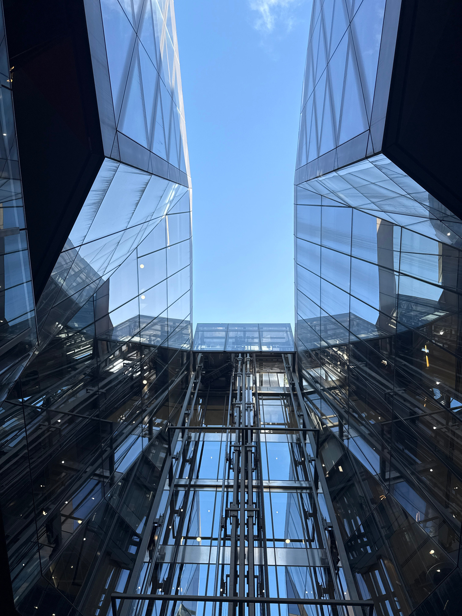 The image shows a low-angle view looking up at modern architecture. Two buildings with glass facades are visible, angled toward each other with a narrow gap of clear blue sky between them. The buildin…read more