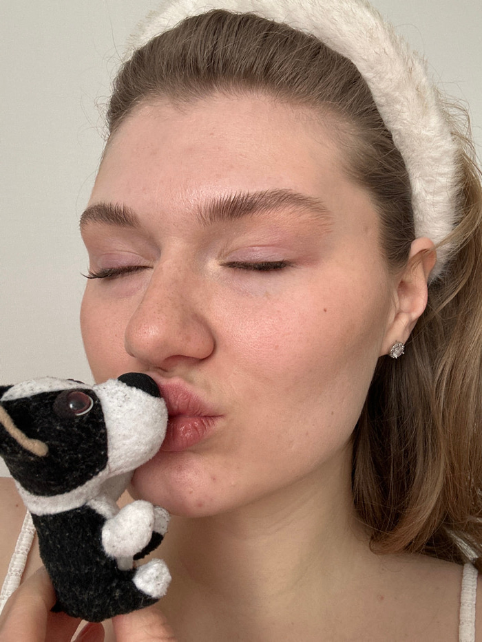 A close-up, front-facing portrait depicts a young adult female from the upper chest upward, performing a kissing gesture towards a small, black and white stuffed animal. The female has light brown hai…read more