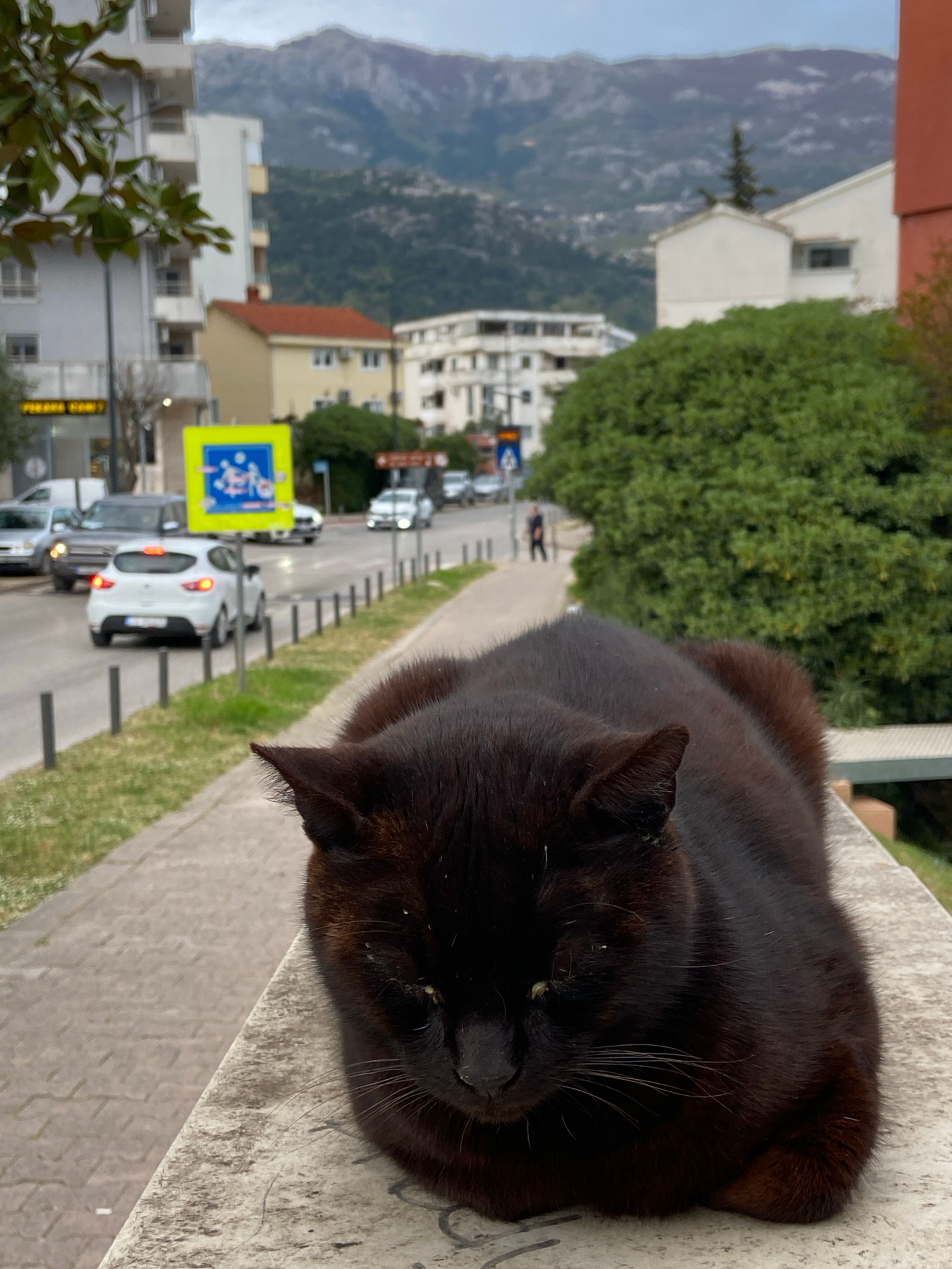 A black cat rests on a stone ledge overlooking a street in Budva, Montenegro. The cat is the central subject, appearing relaxed. In the background, a street lined with buildings and trees is visible.…read more
