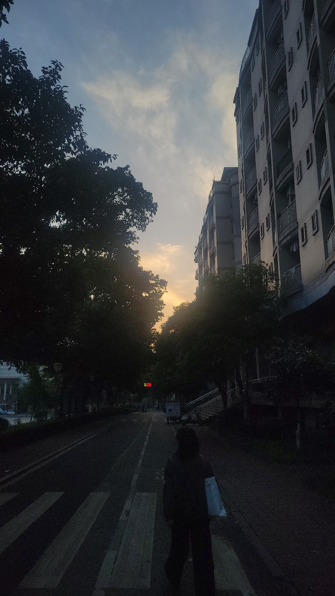 The image depicts a street scene in the Yuzhong District of China, at dusk or dawn, with a multi-story building on the left side of the frame and trees lining the street. A person walks across a zebra…read more
