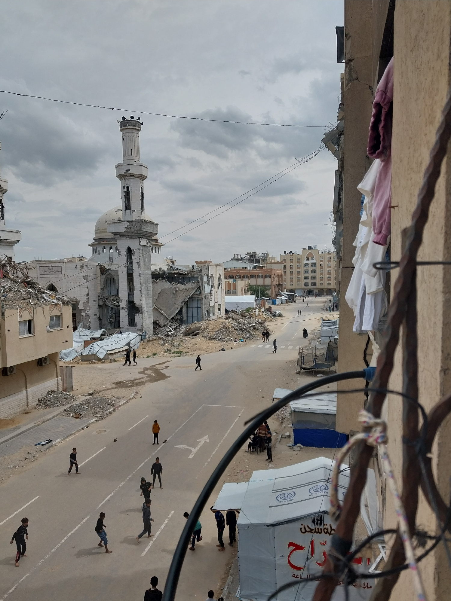 This image presents an elevated view of a damaged urban street in Khan Yunis, Palestinian Territory, under an overcast sky. In the foreground on the right, a blurred metal railing and various fabric…read more