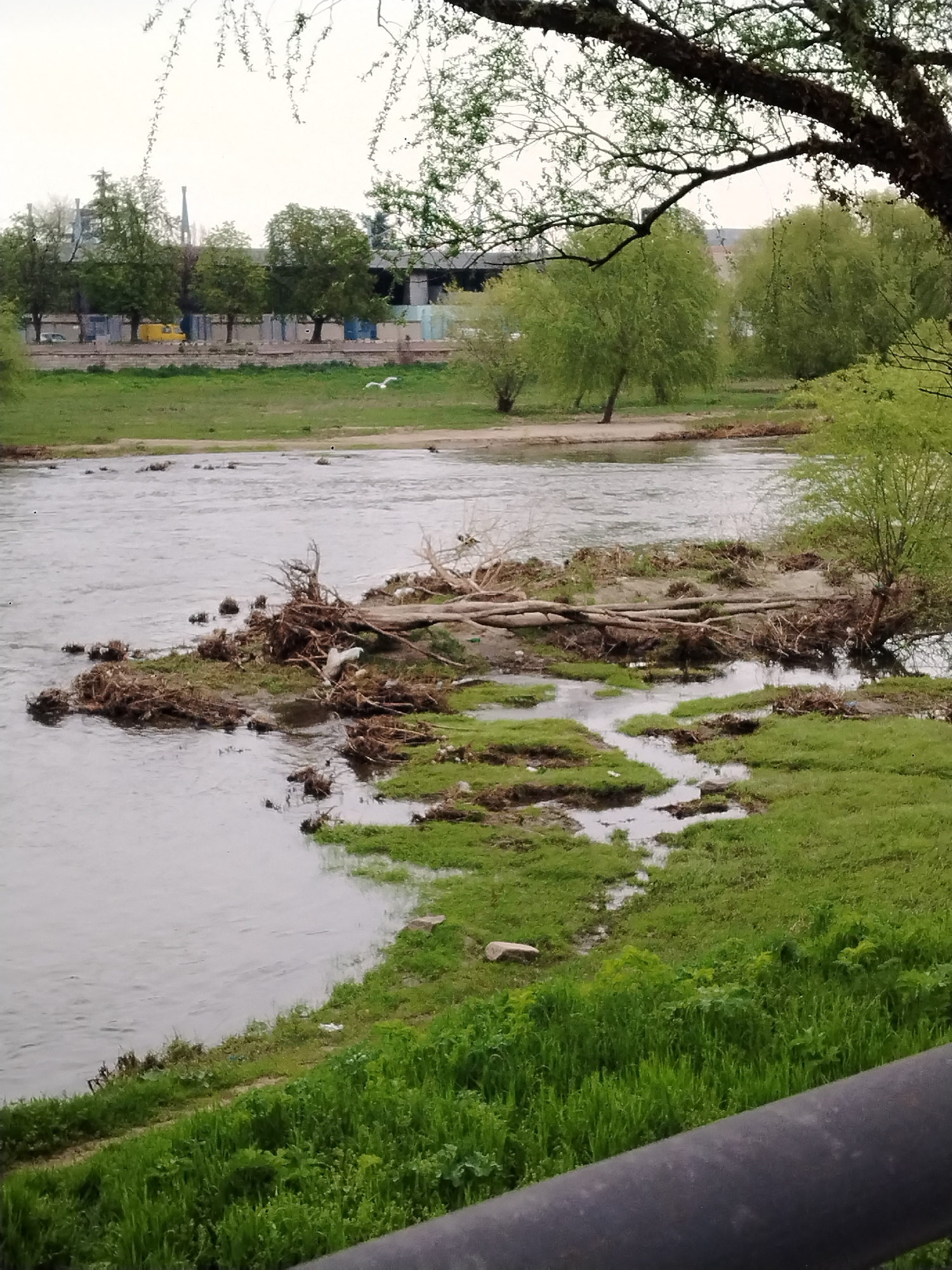 The image depicts a river landscape in Plovdiv, Bulgaria. A body of water flows from left to right, with an island-like formation in the middle cluttered with debris, including tree branches and roots…read more