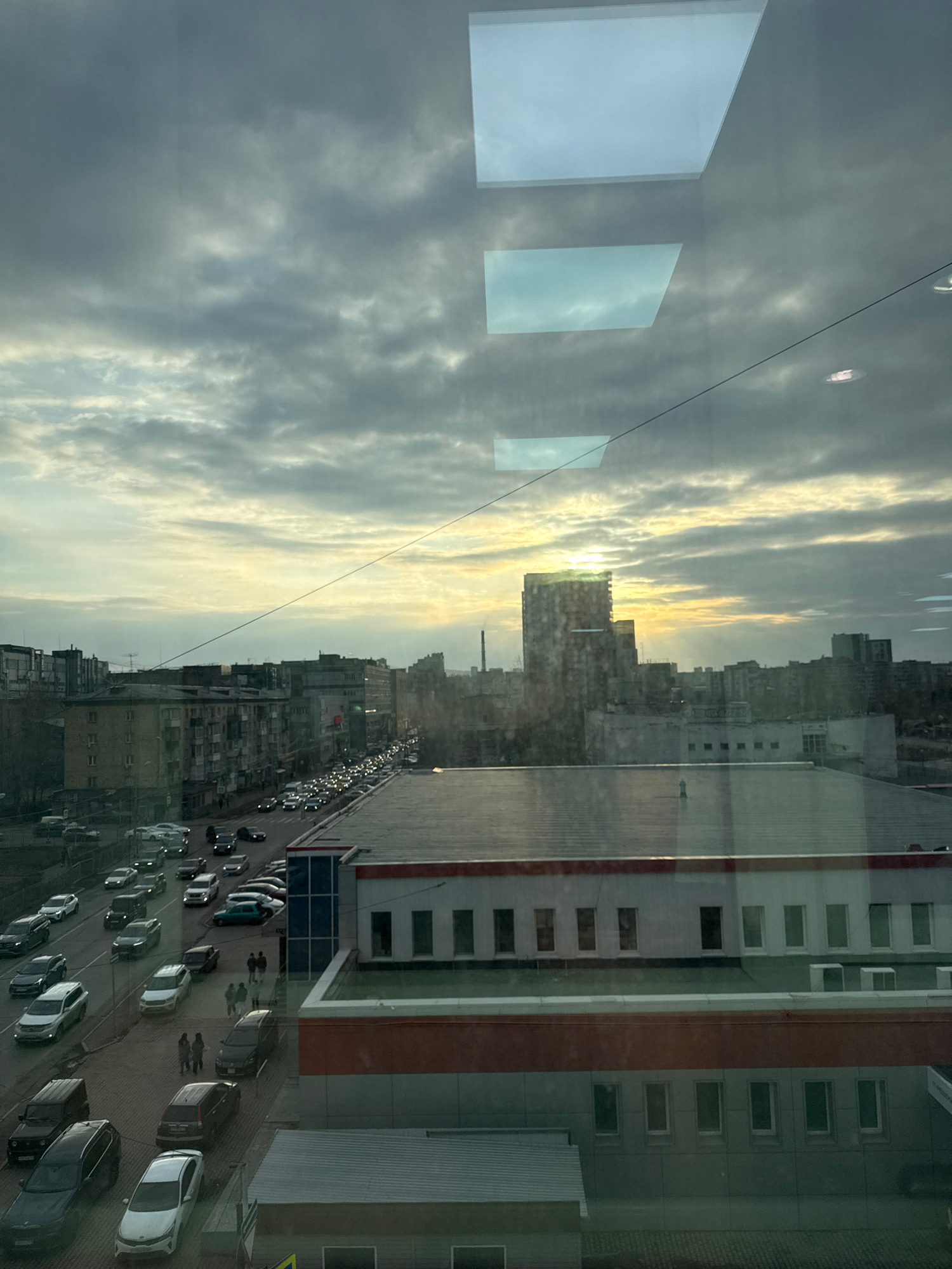 This is an upward-facing, indoor view of an urban scene, likely from a high-rise building in Krasnoyarsk, Russia. The scene shows a dense cityscape under a cloudy, overcast sky. The sun is partially o…read more