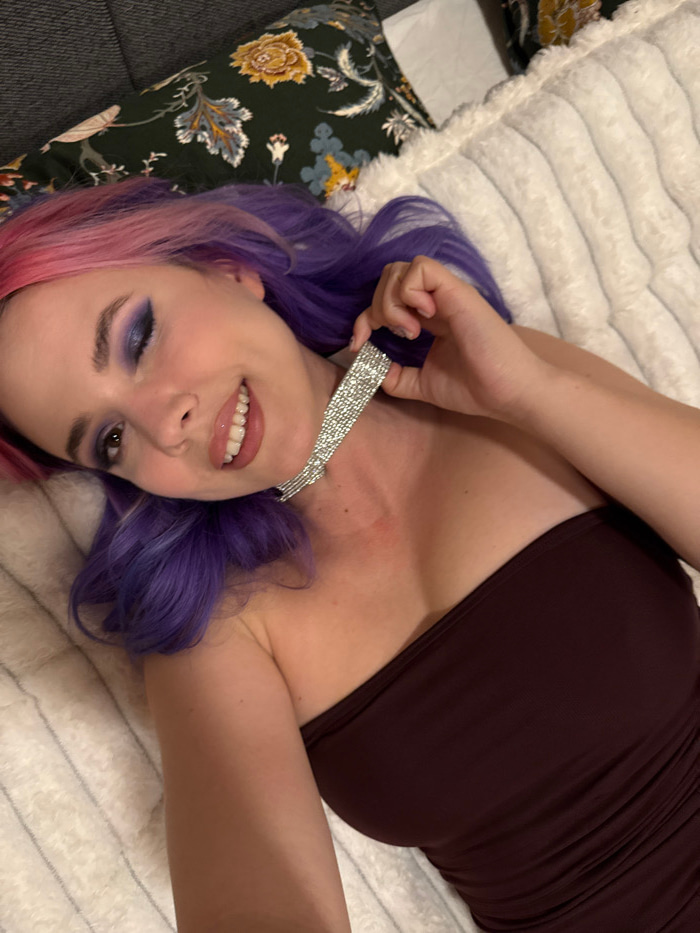 A female individual with fair complexion, pink and purple dyed hair, and blue eyeshadow lies on her back, angled towards the upper left of the frame. She wears a dark maroon, strapless, ribbed garment…read more