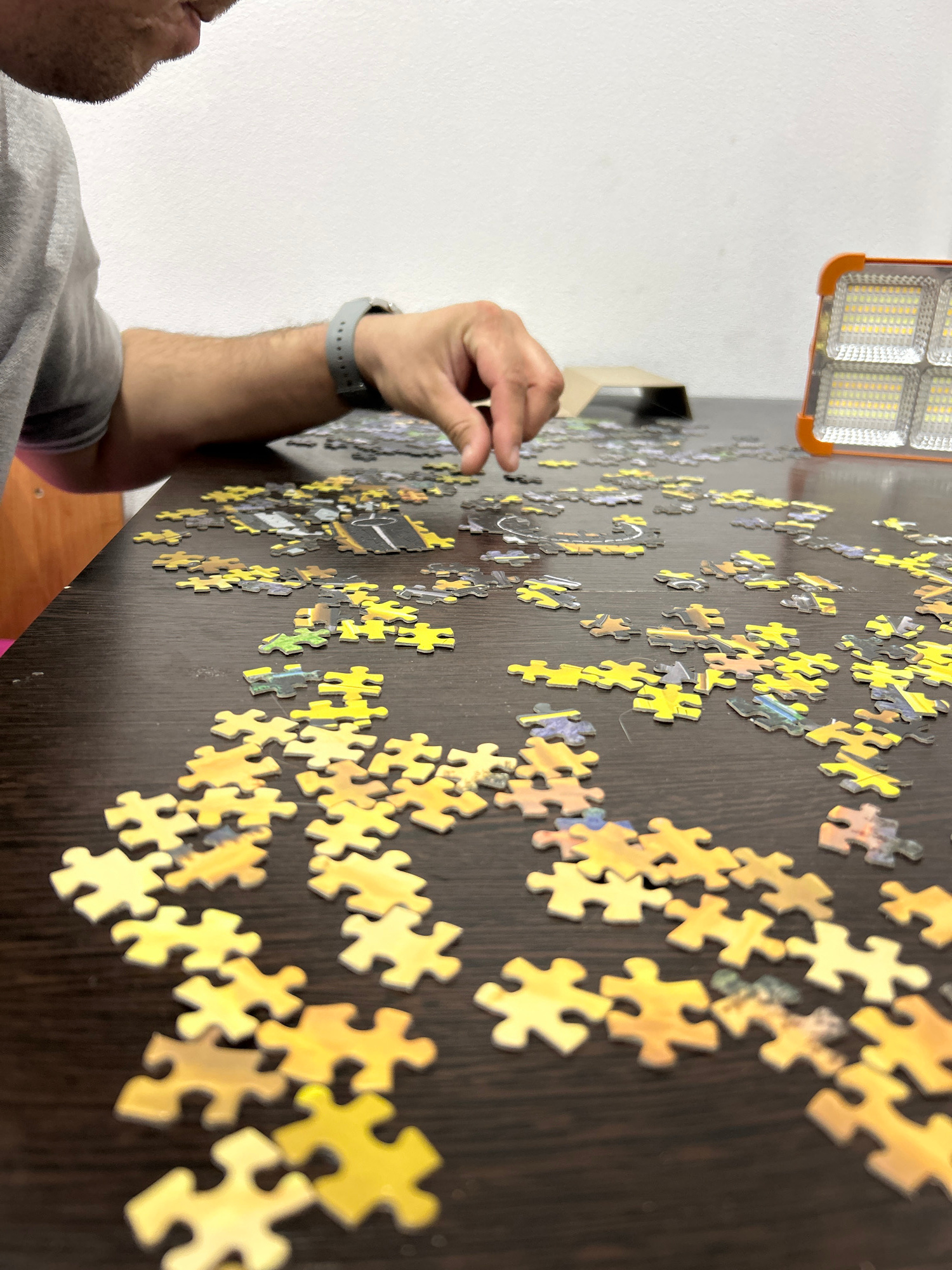 The image, captured from a low, upward-looking perspective, depicts a person engrossed in assembling a jigsaw puzzle on a dark wooden table in Rusalevka, Russia. The person, seen from the chest up and…read more