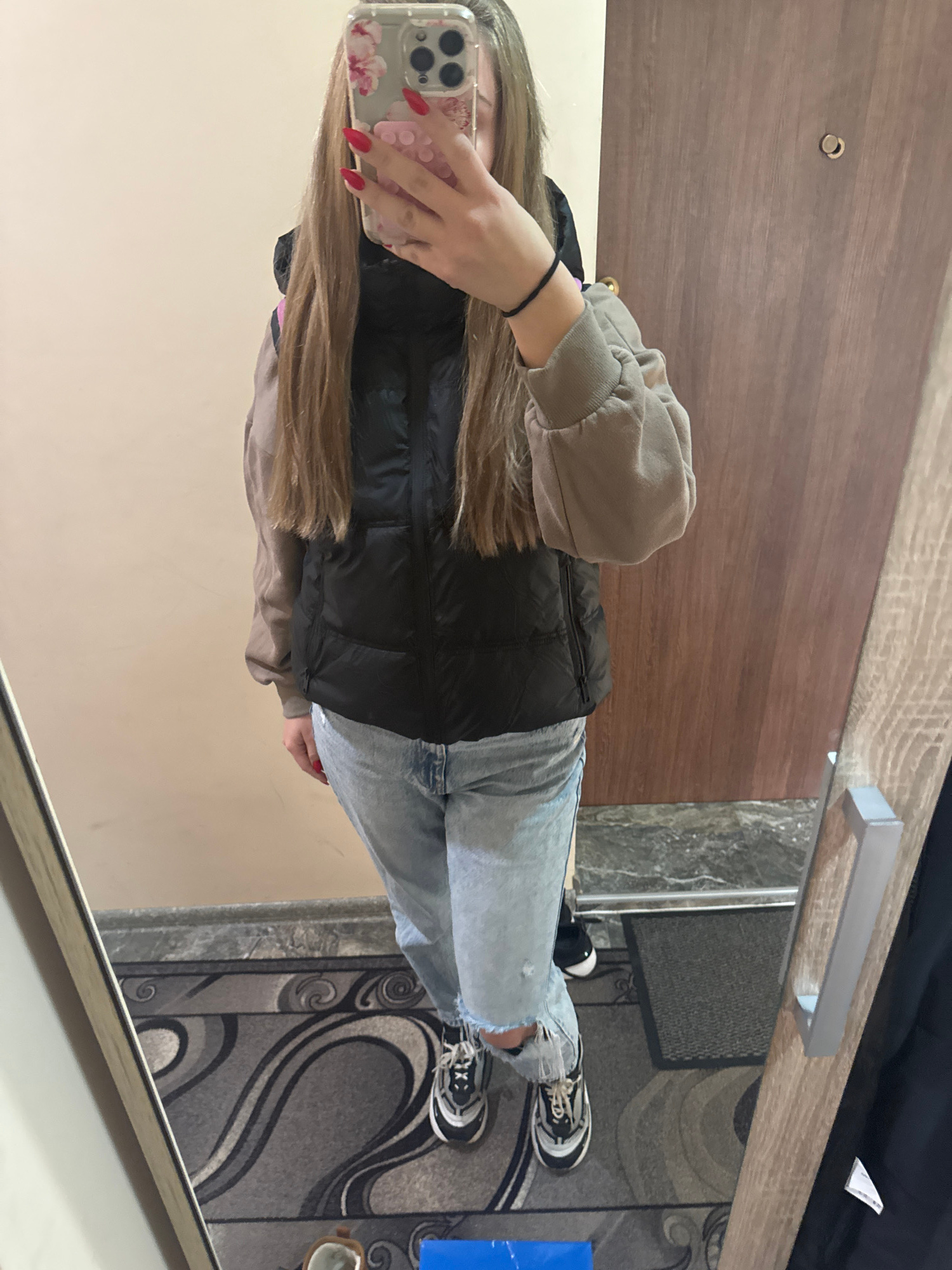A medium shot shows a person taking a selfie in front of a mirror. The individual has long, blonde hair and is wearing a beige sweatshirt, a black puffer vest, and light blue jeans. They are holding a…read more