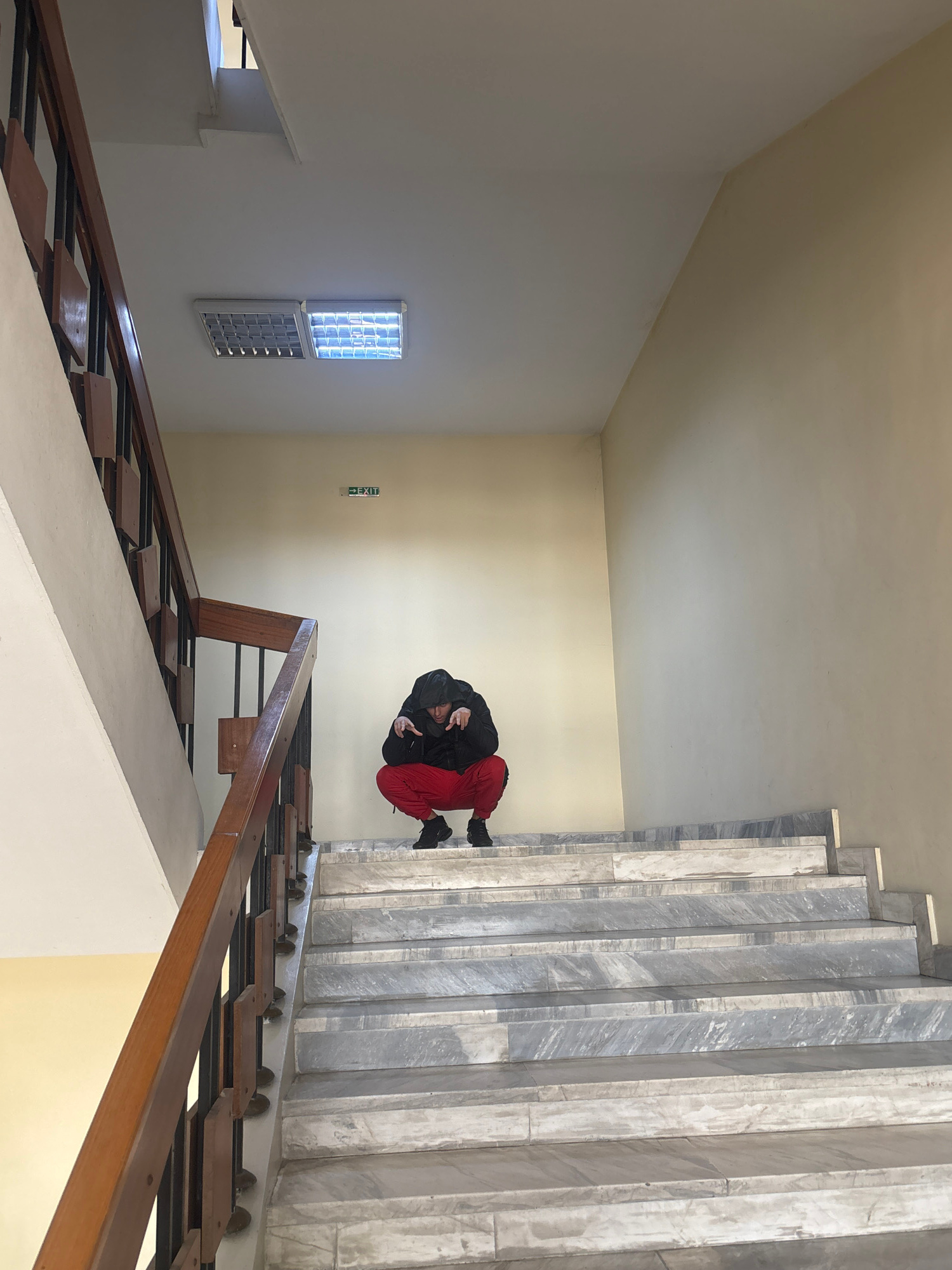 This image, when properly oriented, depicts a spacious indoor stairwell within a multi-story building, located in Plovdiv, Bulgaria. The perspective is looking down the stairwell, revealing several fl…read more