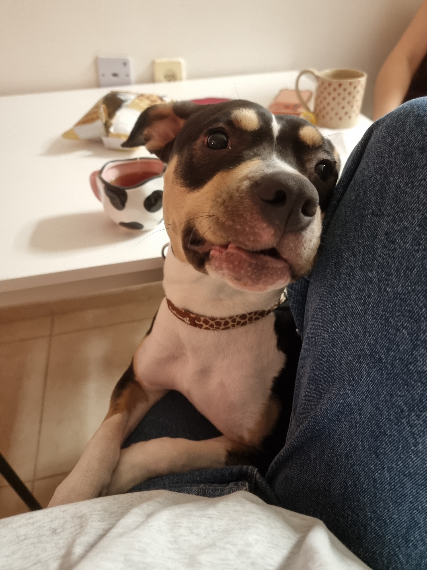 The scene depicts an indoor domestic environment within the city of Tel-Aviv, Israel; a precise address is not discernible. The primary subject is a medium-sized, short-haired tricolor dog, exhibiting…read more