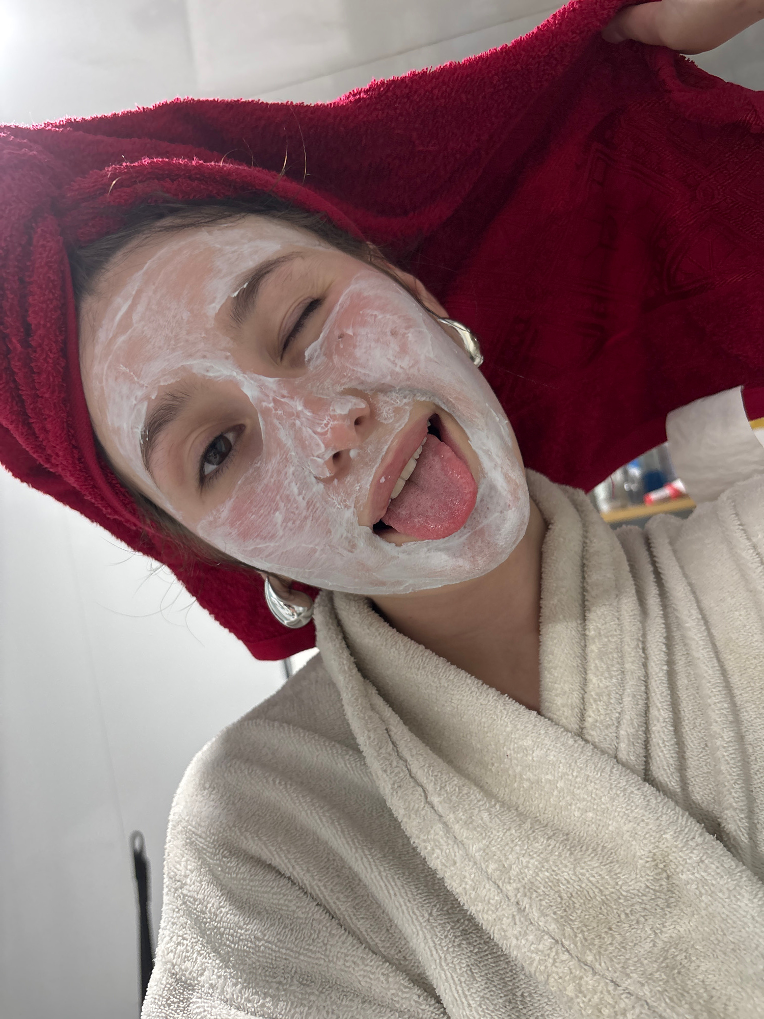 A person is lying down, facing upwards, with a white facial mask on and their tongue sticking out. They are wearing a red towel on their head and a white terry cloth robe. The location is Фоки, Russia…read more