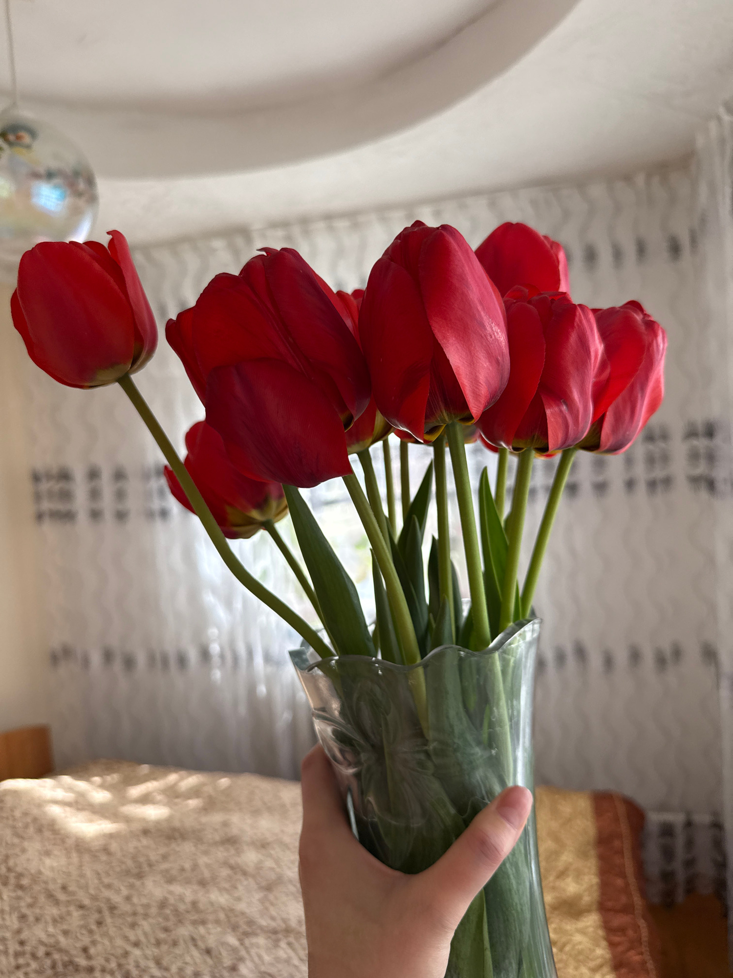 A hand is holding a vase filled with red tulips. The vase appears to be clear and cylindrical. The background is a blurry combination of a white patterned curtain or wall and a beige/brown surface, li…read more