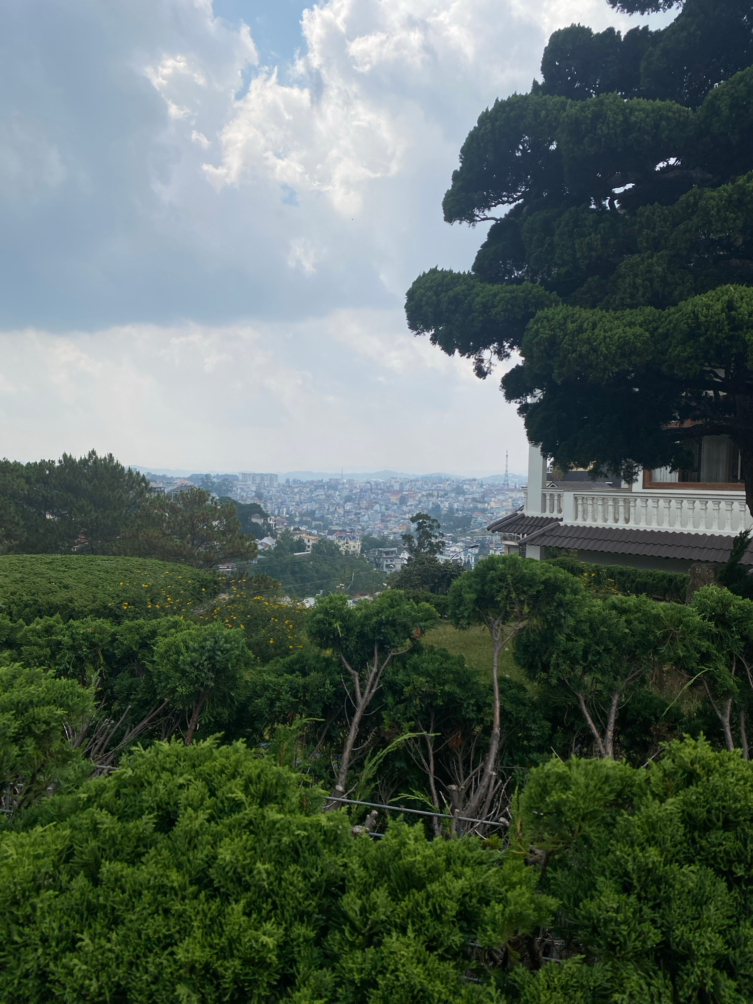 The image presents a view overlooking Da Lat, Vietnam, framed by trees and part of a building. The urban landscape of Da Lat is visible in the distance under a cloudy sky. The foreground features densβ¦read more