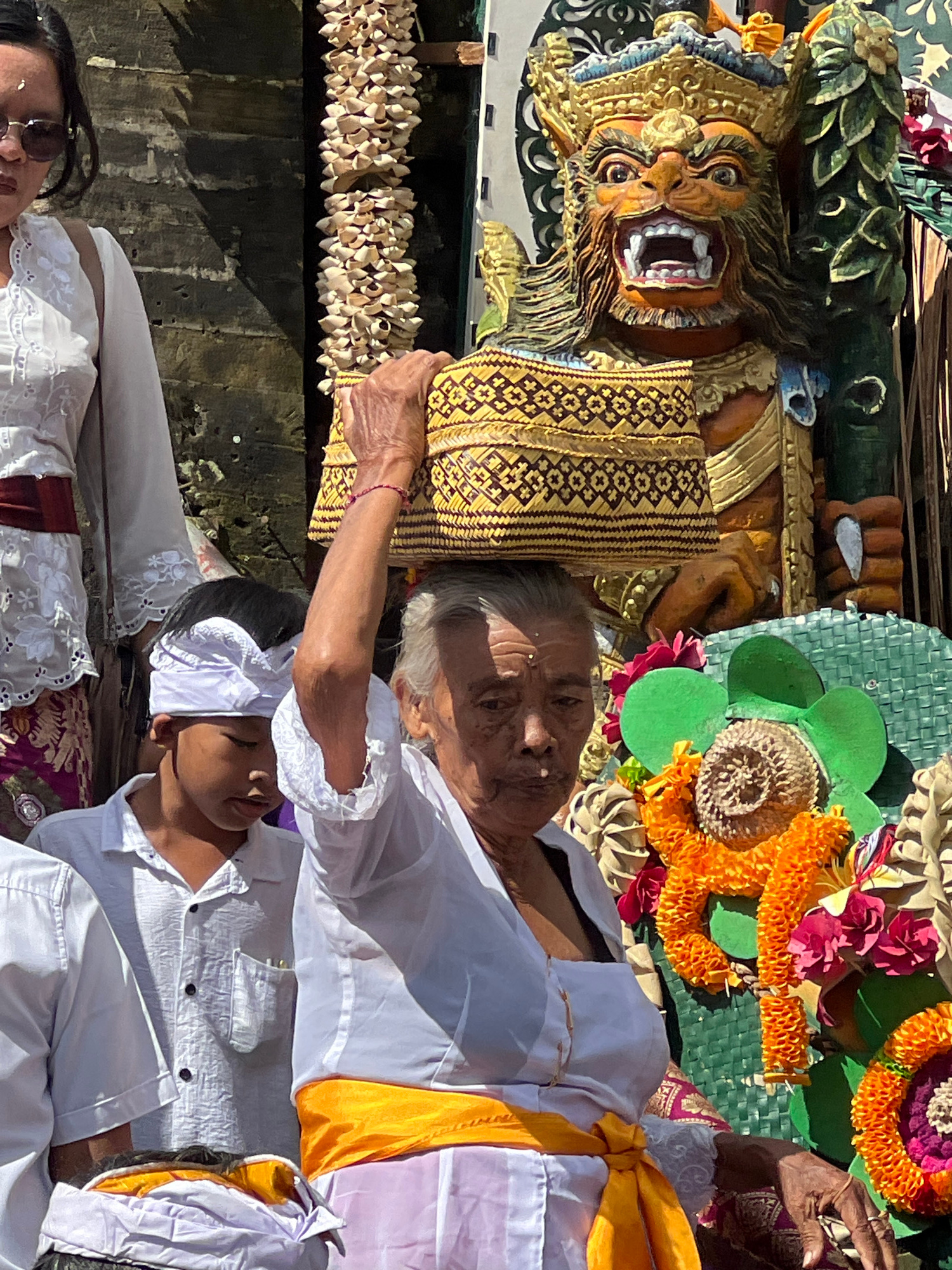 The image depicts a cultural scene in Kintamani, Indonesia. An elderly woman, dressed in a white shirt and orange sash, is positioned near a carved wooden figure with an open mouth. The figure is moun…read more