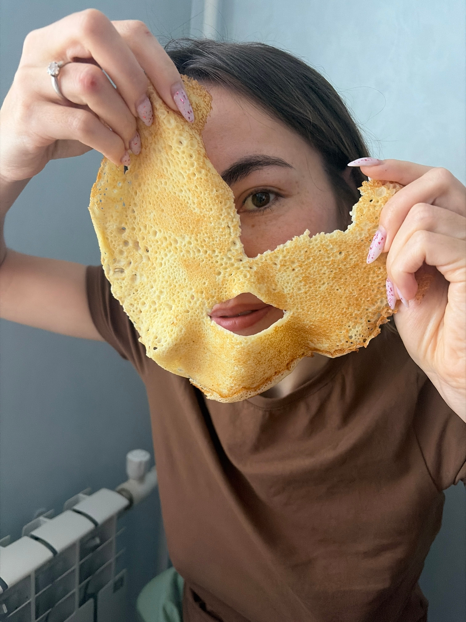 A person is holding a thin, tan, crepe-like food item in front of their face. The food item has holes torn out for the eye and mouth. The person is wearing a brown shirt and has pink and white speckle…read more