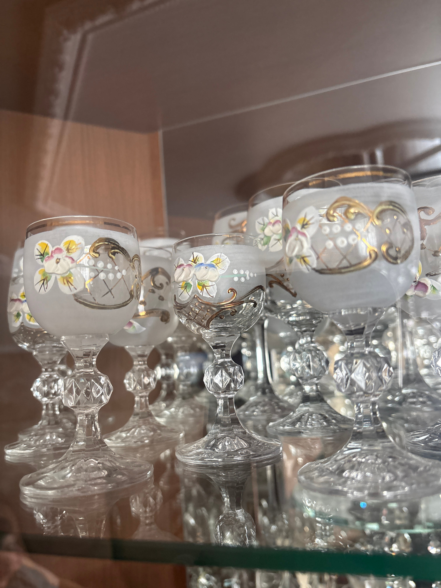 The image displays a close-up, rotated view of decorative glassware, likely part of a display or collection, reflecting on a polished surface. The primary subjects are several small, frosted glass cup…read more