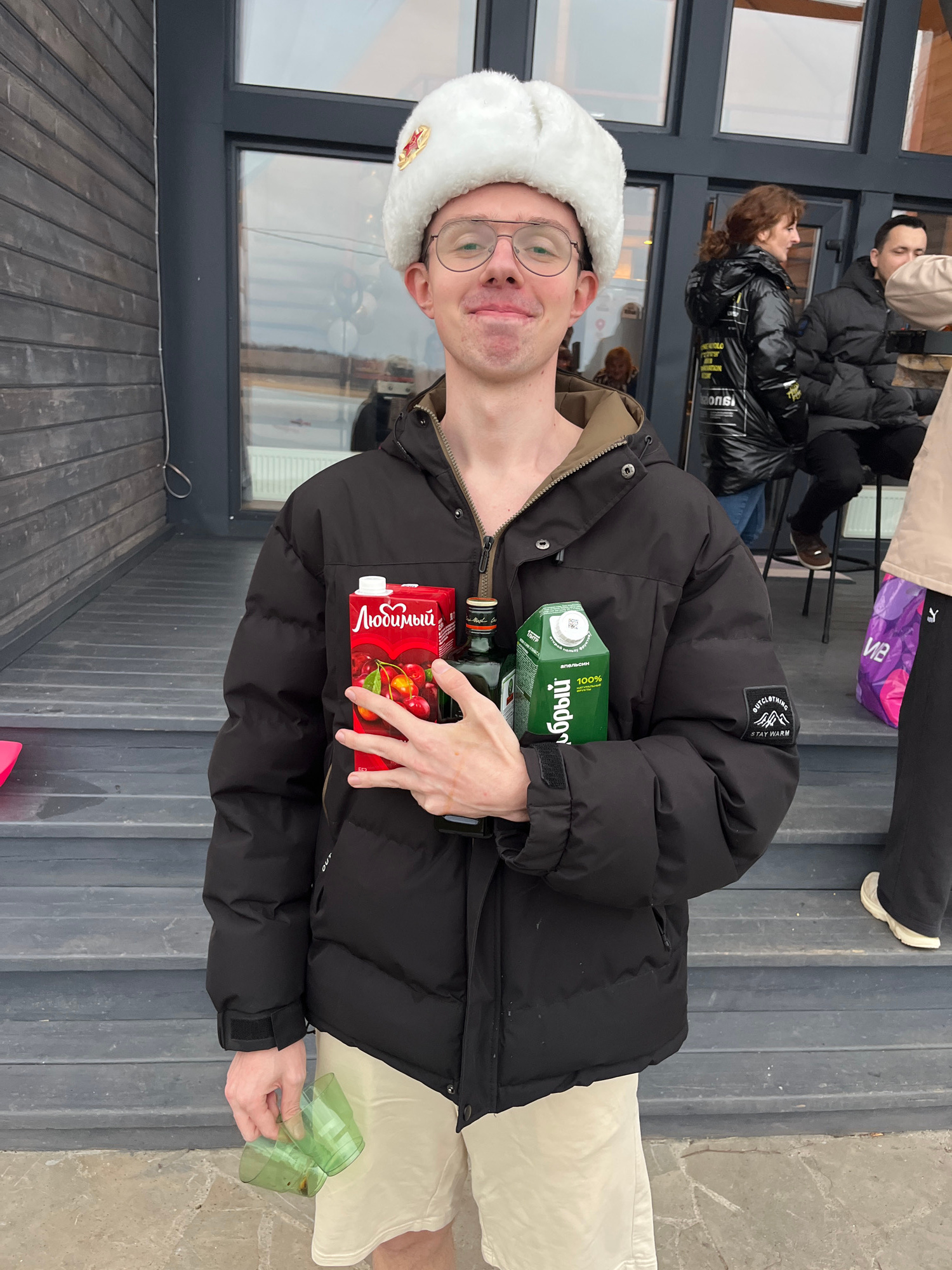 A man in a white fur hat and glasses stands on a wooden deck, wearing a black puffer jacket, holding a bottle of Jagermeister, a carton of "Любимый" cherry juice, and a carton of "Добрий" apple juice…read more
