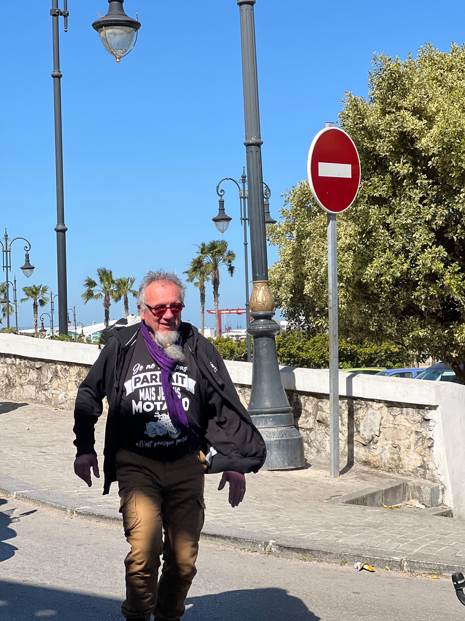 An eye-level, outdoor shot captures a man in casual attire on a sunny day. The man is wearing a black long-sleeved shirt with a distinctive logo of "Je ne PARIAIT MAIS JE MOTA" in white letters, paireβ¦read more