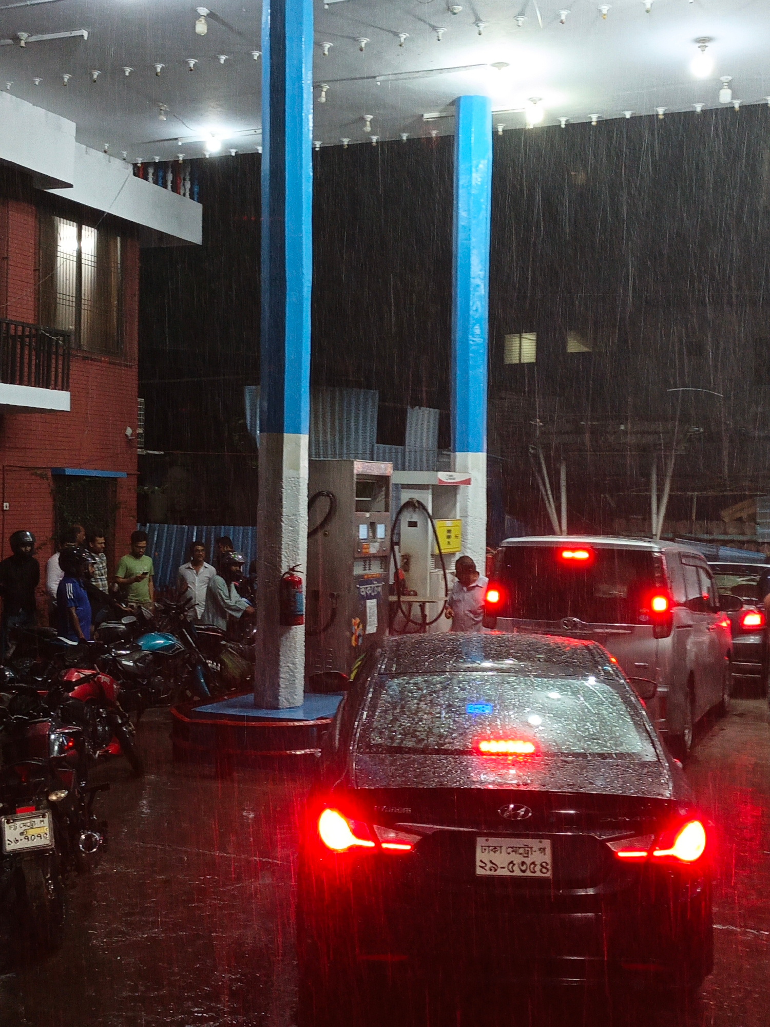 The image shows a gas station in Dhaka, Bangladesh, on a rainy night. A black car is in the foreground with its brake lights on. A gray minivan is directly behind it, also with its brake lights illumi…read more