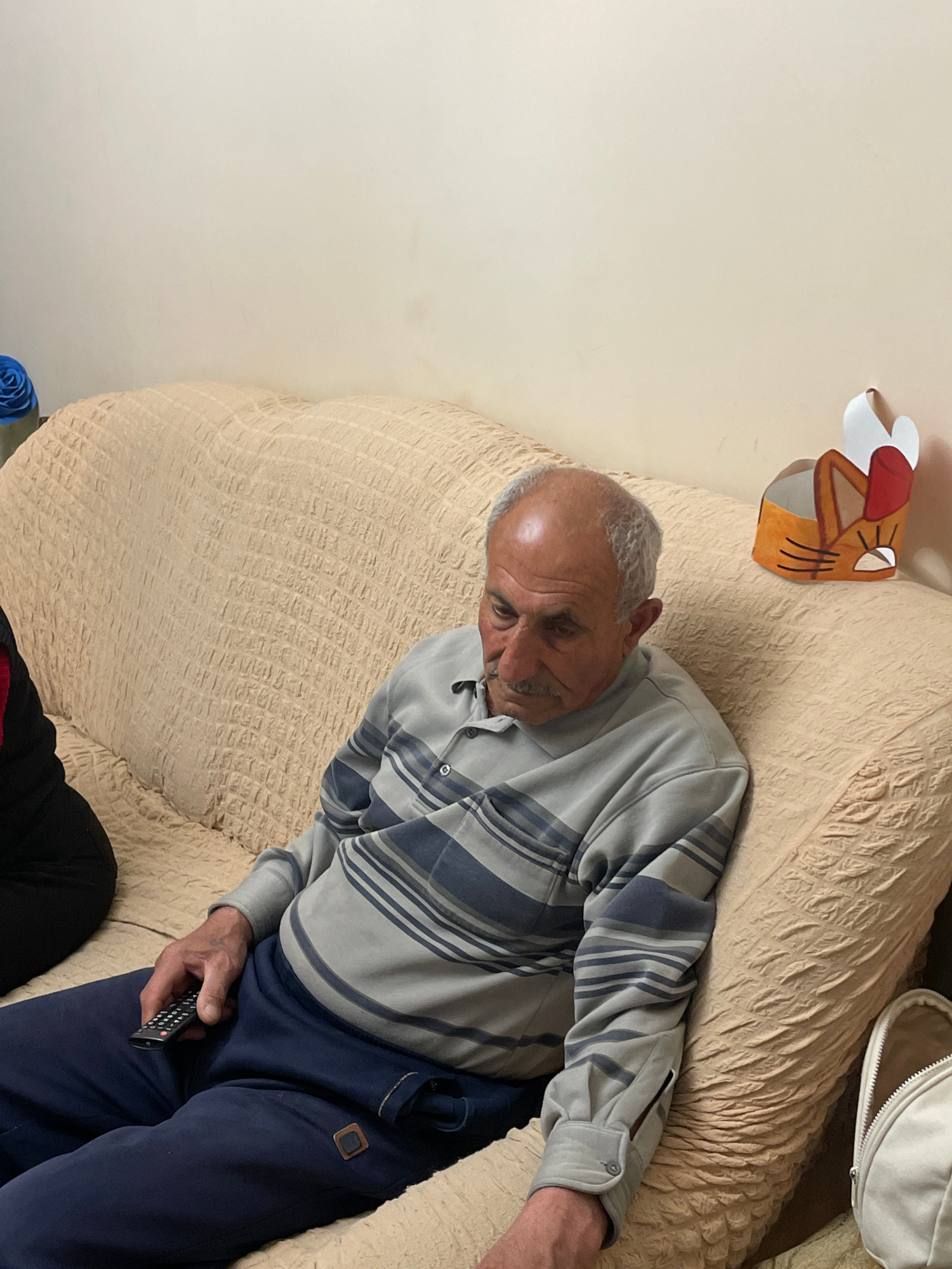 An elderly man is reclining on a textured, beige sofa indoors. He is wearing a grey striped long-sleeved shirt and navy blue pants, and holding a black remote control in his right hand. A cartoon-styl…read more
