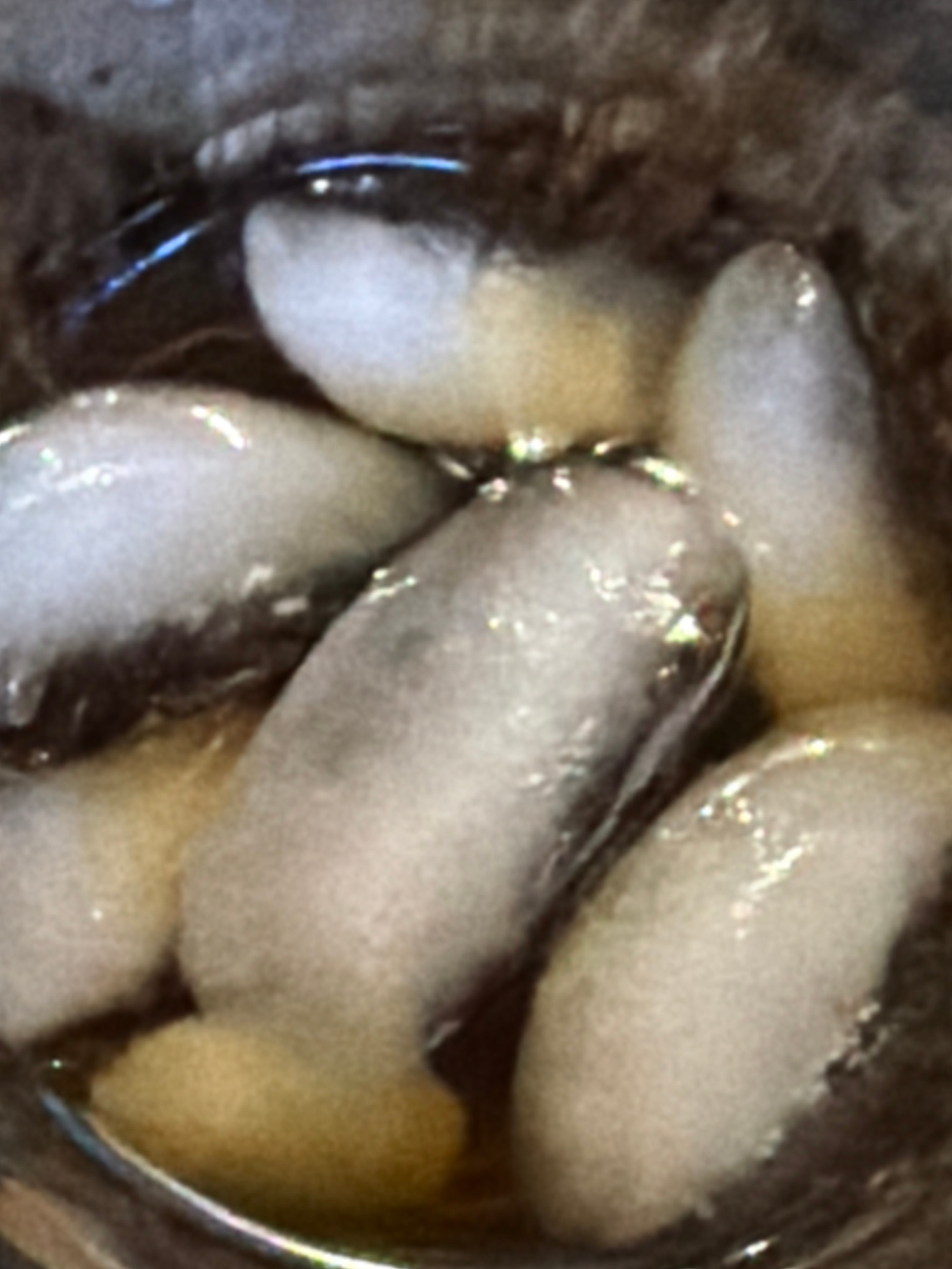 A close-up shot shows a glass filled with a brown liquid, presumably iced tea or a similar beverage, containing several ice cubes. The ice cubes are cylindrical or slightly elongated in shape, showing…read more