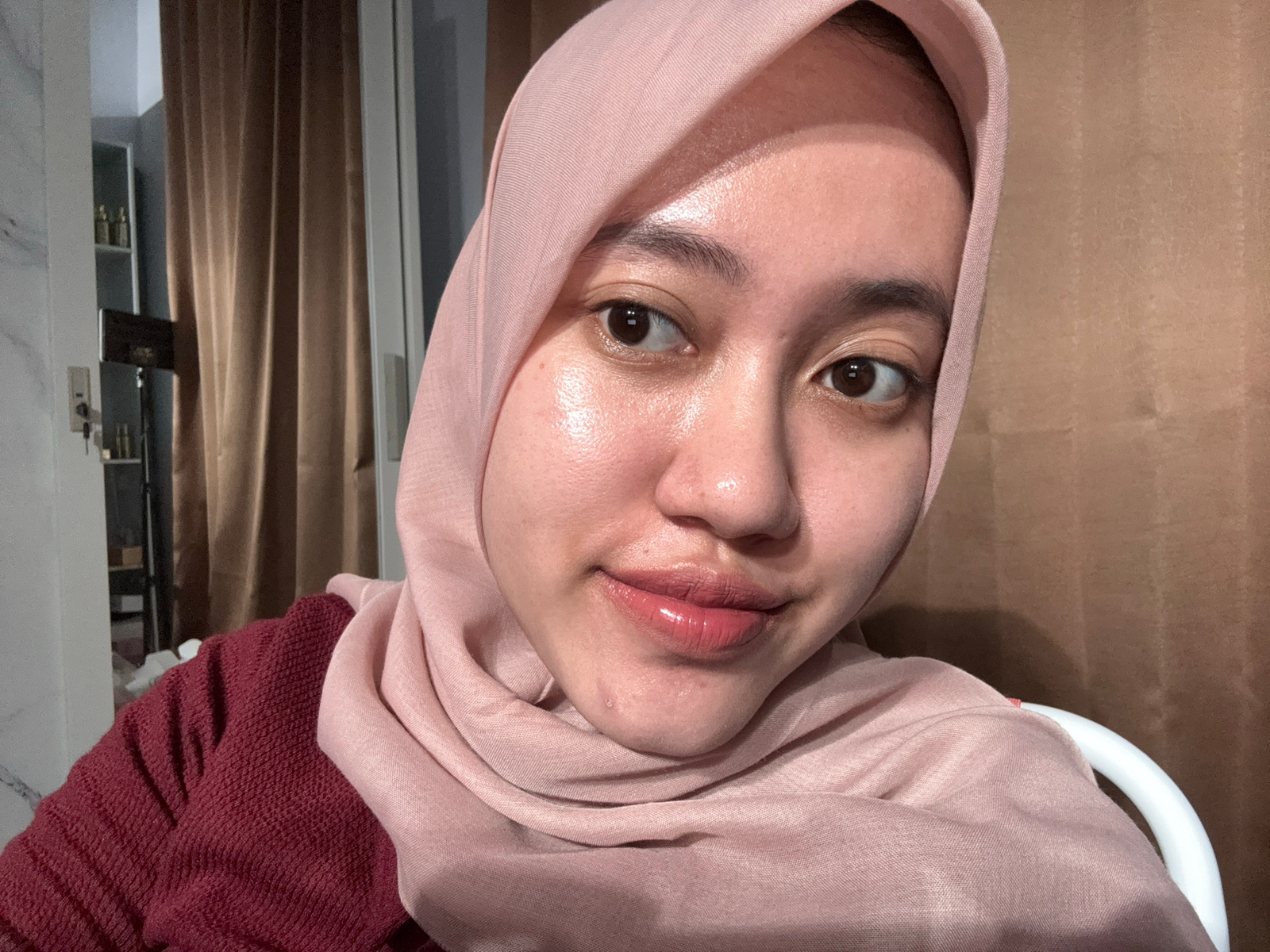 A person wearing a pink hijab and a maroon sweater is photographed indoors. The person has brown eyes and glossy lips. Behind them, there's a white chair and a brown curtain. A door and other househol…read more
