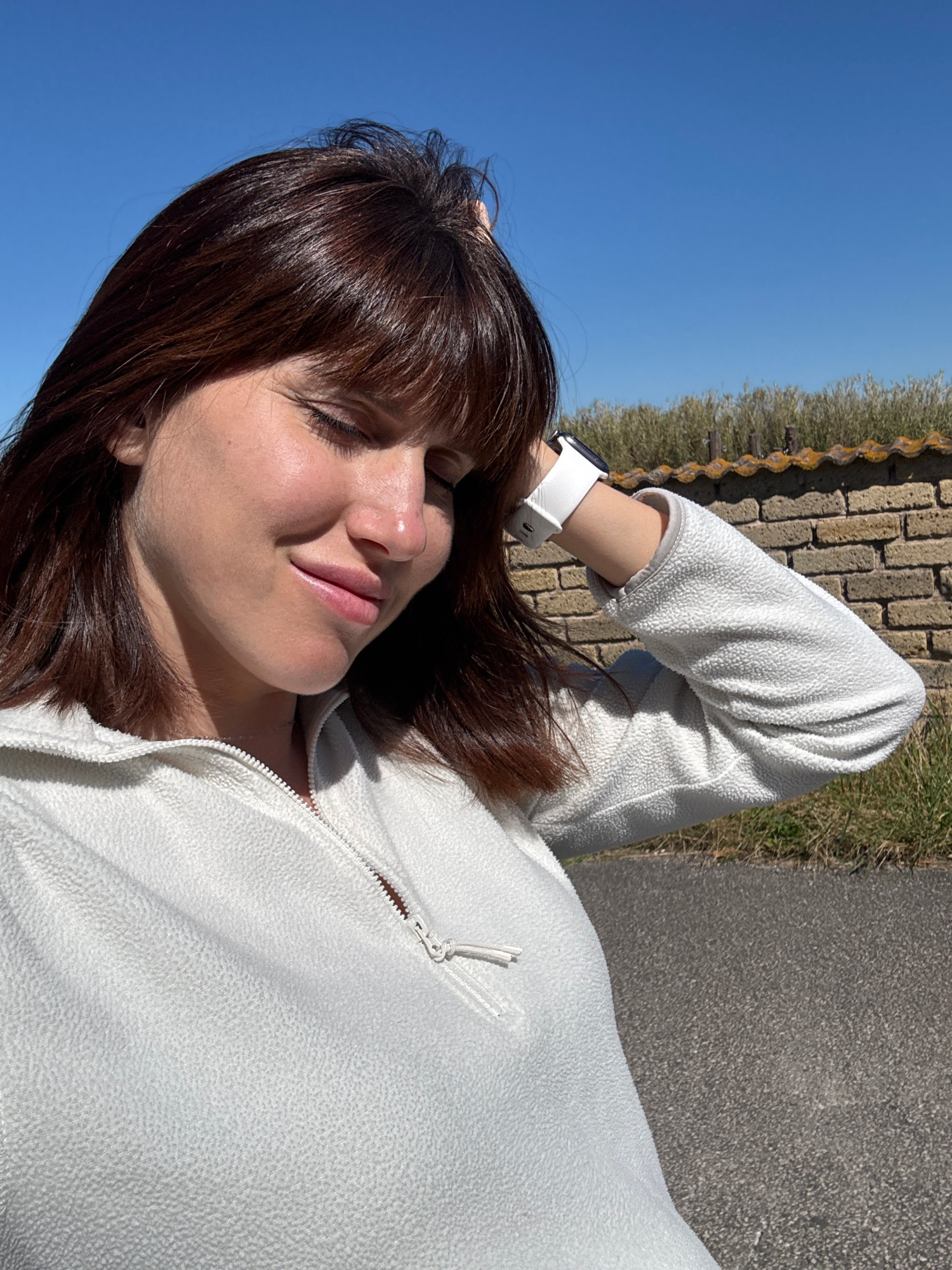 The image shows a woman lying on what appears to be asphalt, possibly a road or path. She is wearing a white fleece jacket and has dark hair with bangs. A white smartwatch is visible on her left wrist…read more