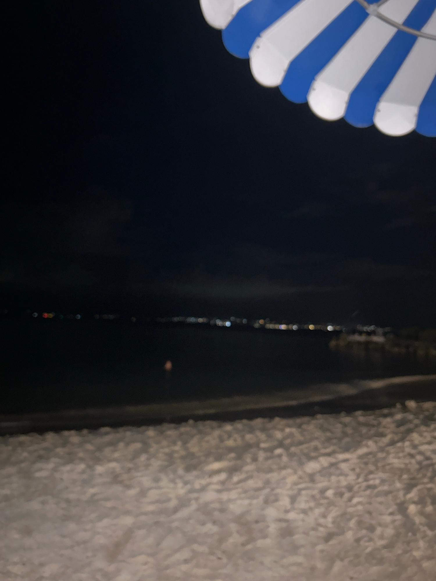The image shows a night scene in Le Gosier, France, likely taken near the coast. In the upper left corner is a partially visible parasol or awning with alternating blue and white panels. The central a…read more