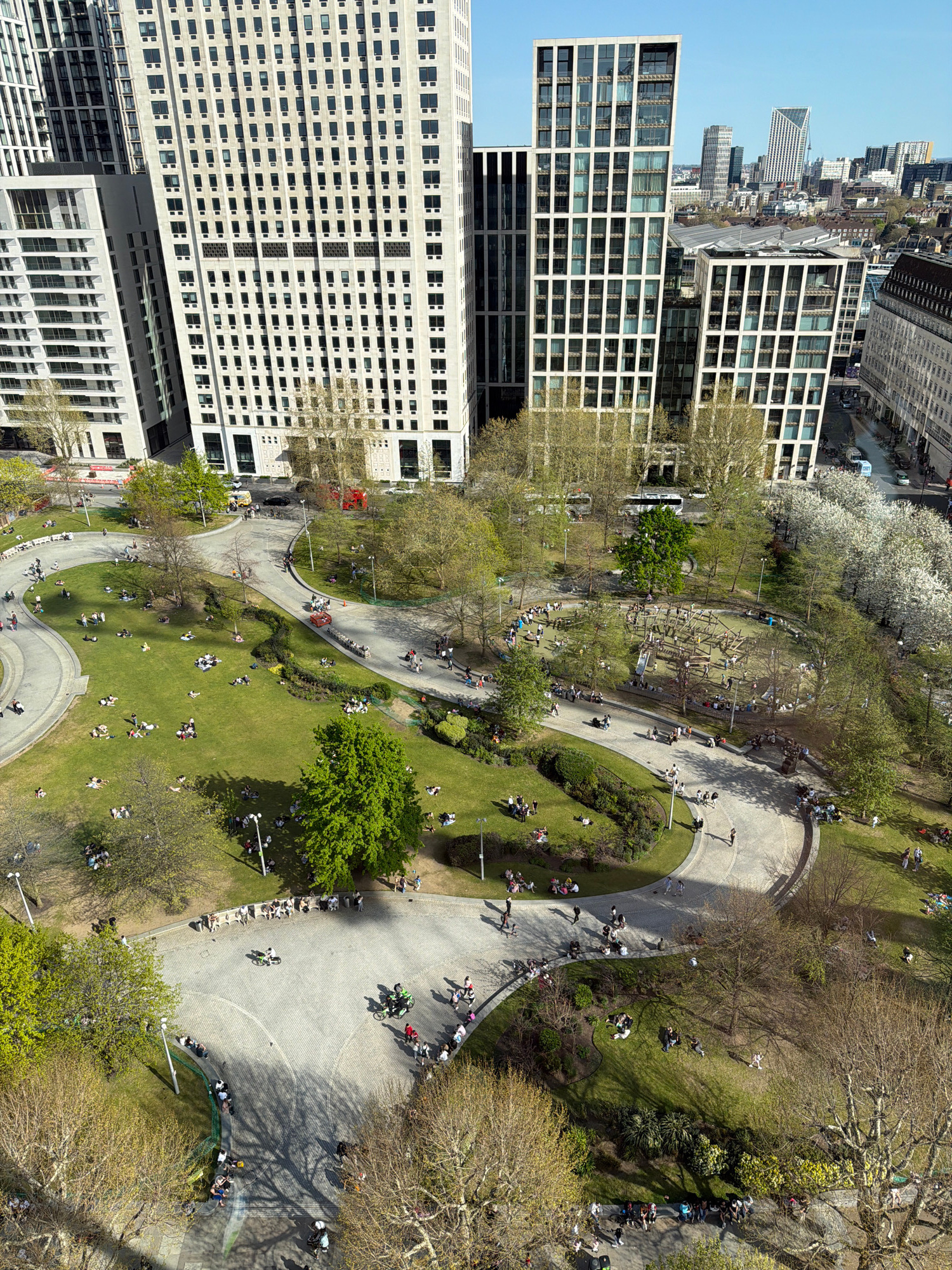 The image presents an aerial view of a park with buildings in the background. The park features meandering walkways populated by people walking, jogging, and cycling. Patches of green grass are occupi…read more