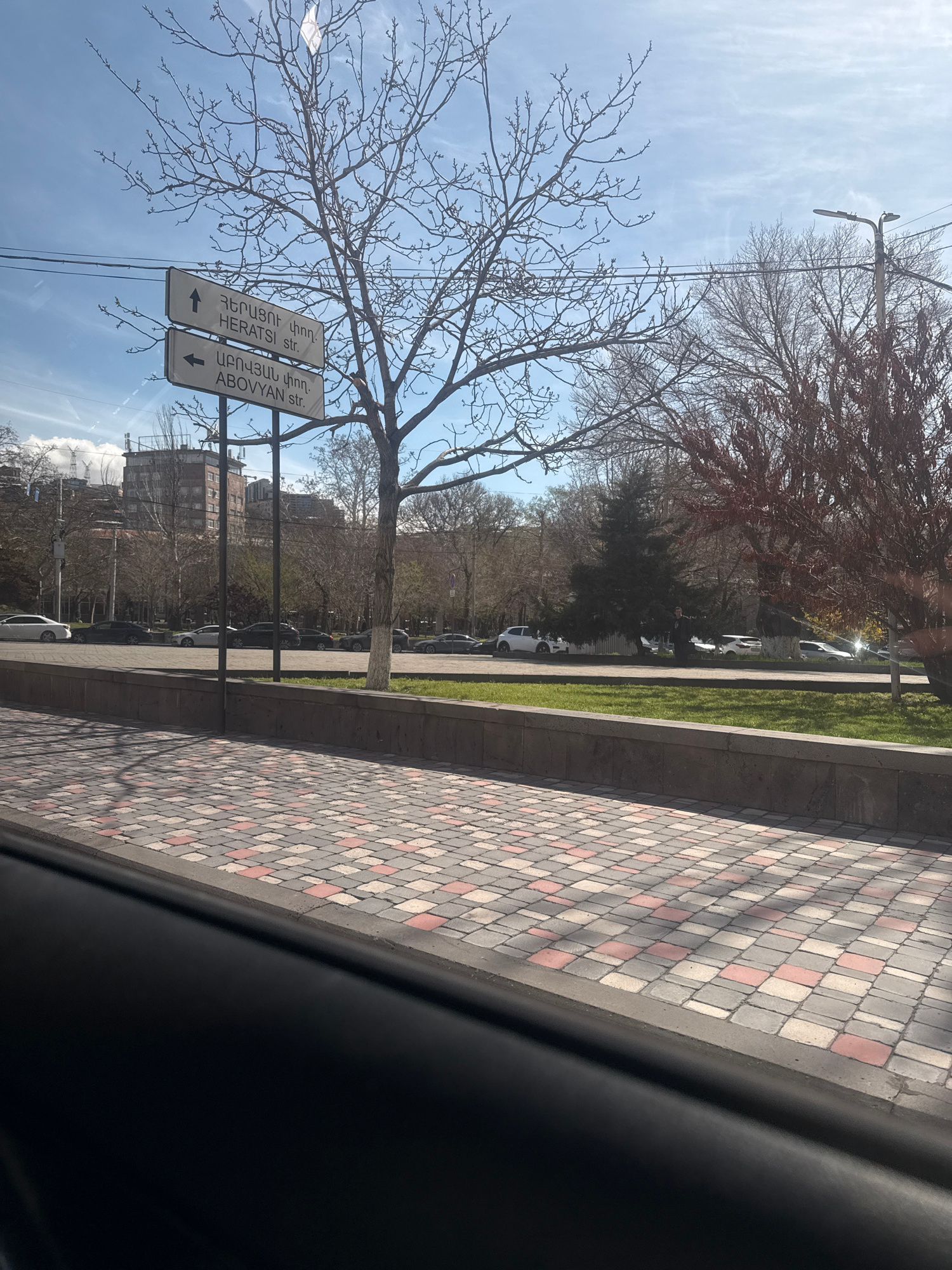The image depicts a street scene in Yerevan, Armenia. A street sign indicates directions to Heratsi Street (left) and Abovyan Street (right). The foreground features a paved sidewalk with a pattern ofโฆread more