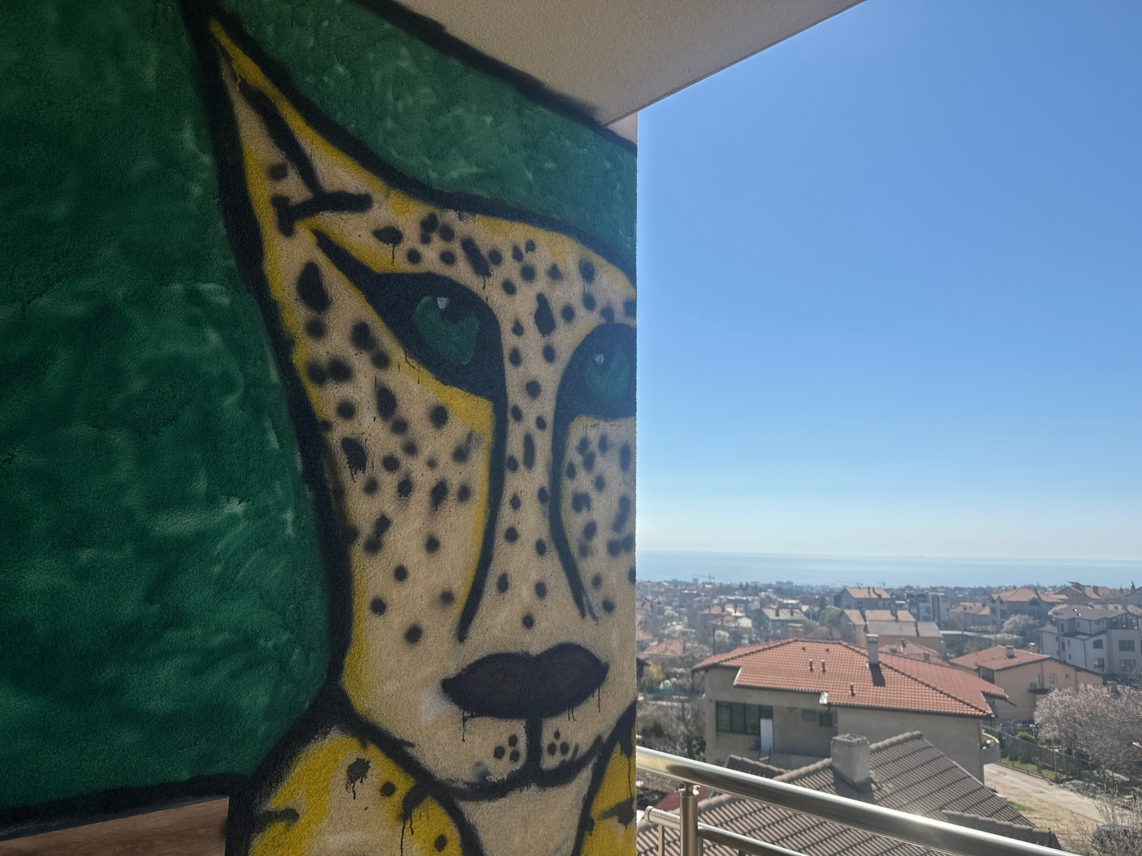 A partially visible mural of a leopard's face is on the left, juxtaposed against an exterior view of the city of Varna, Bulgaria on the right. The leopard has green eyes and black spots, and is painte…read more