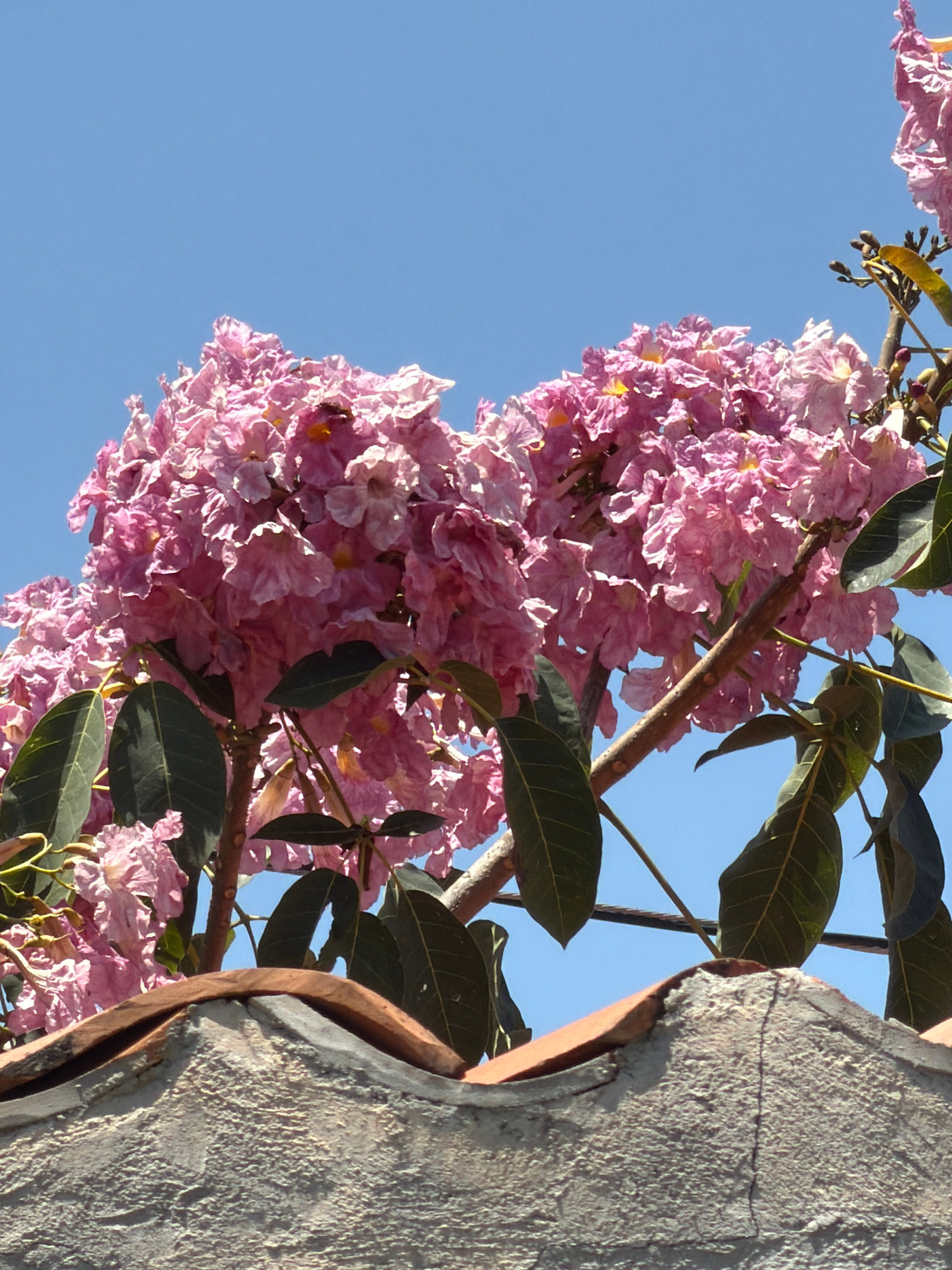 A close-up, low-angle shot showcases a cluster of pink Tabebuia rosea flowers in full bloom, set against a clear, blue sky. The blossoms are densely packed, with a mix of light and dark pink hues, andβ¦read more