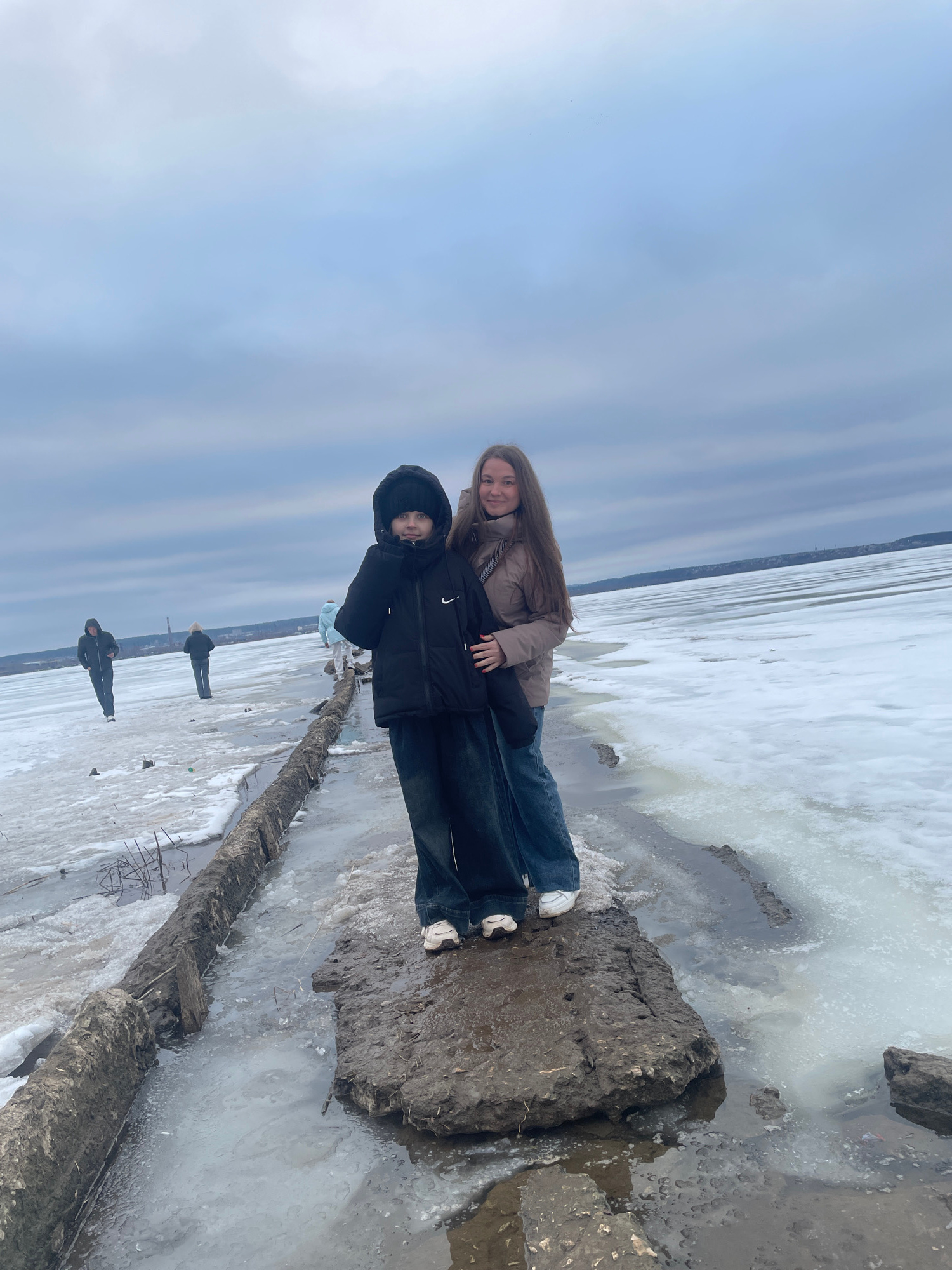 Two individuals are posing for a photo on a concrete structure near a body of water covered with ice. The individual in the front is wearing a black jacket with a hood, while the person behind is wear…read more
