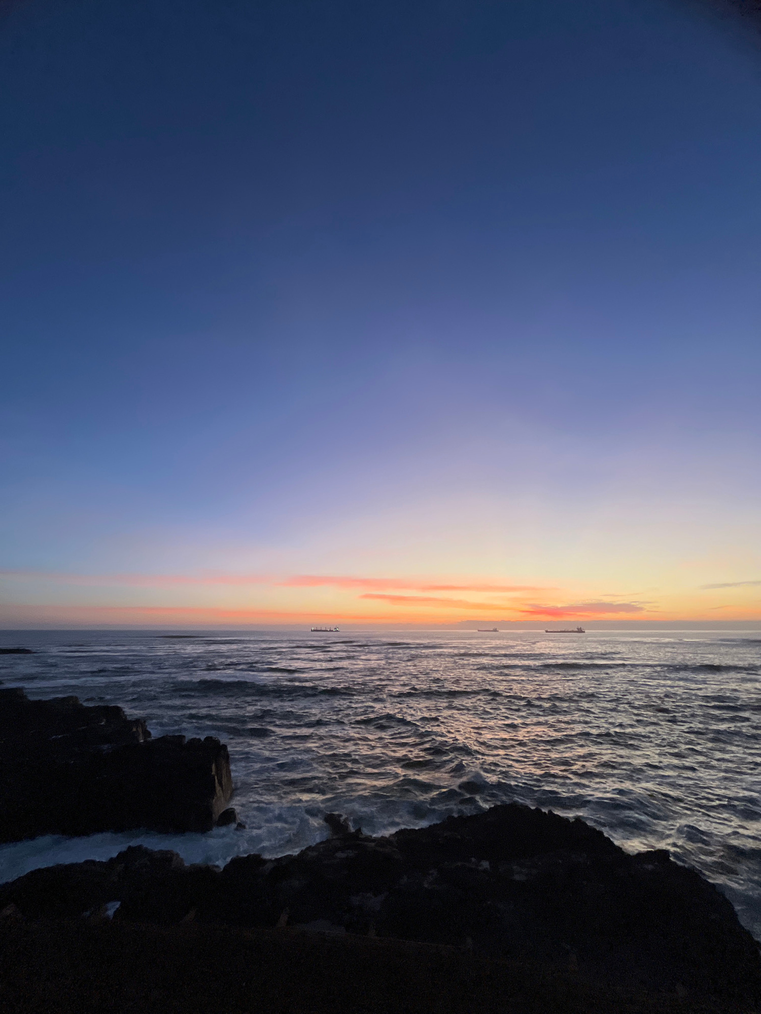 The image shows an ocean view at sunset, likely taken from a high vantage point. The sky transitions from a dark blue on the left to orange and yellow hues near the horizon. The ocean is choppy with w…read more
