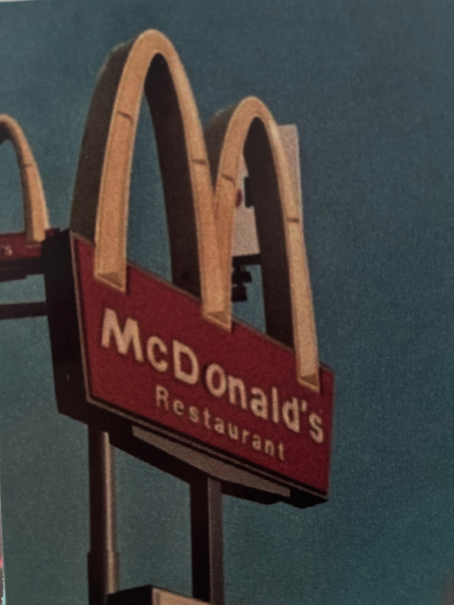The image shows a McDonald's restaurant sign with the iconic golden arches and a rectangular sign reading "McDonald's Restaurant" in red letters. The background is a blurry blue-grey color, suggesting…read more