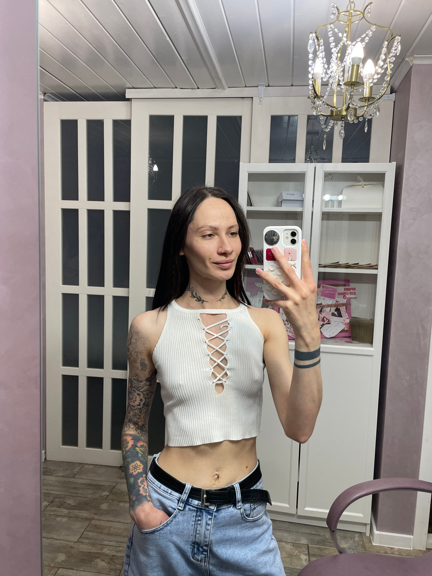 A woman is taking a selfie in a room. She has dark hair and tattoos on her arm and neck. She is wearing a white crop top and light blue jeans with a black belt. She is holding a white smartphone withβ¦read more