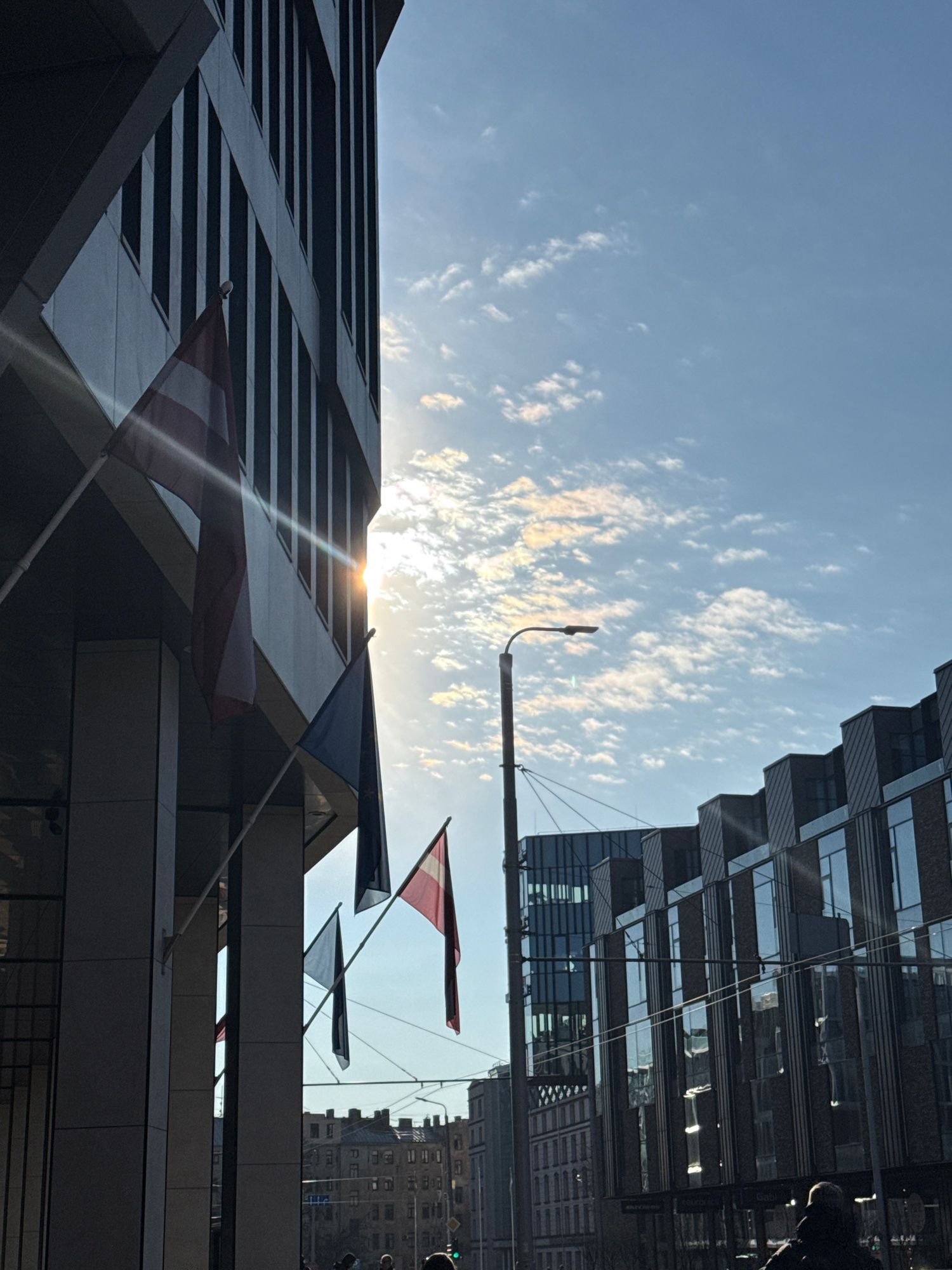 The image shows a view looking up between buildings in Riga, Latvia. The sky is light blue with wispy clouds. Modern architectural elements are visible, with buildings displaying glass facades and lin…read more